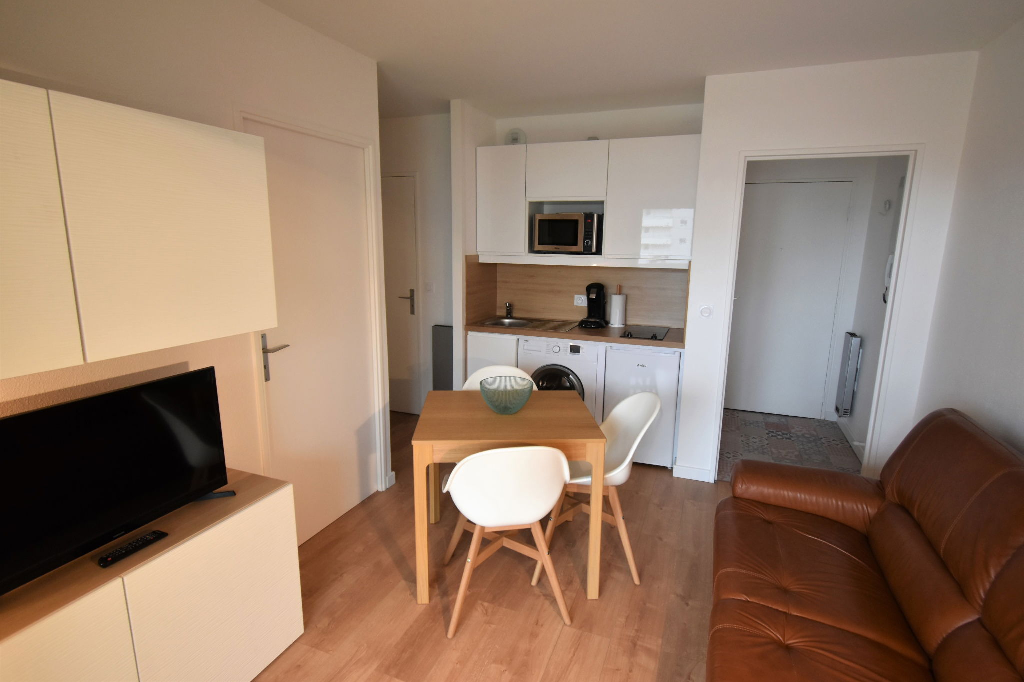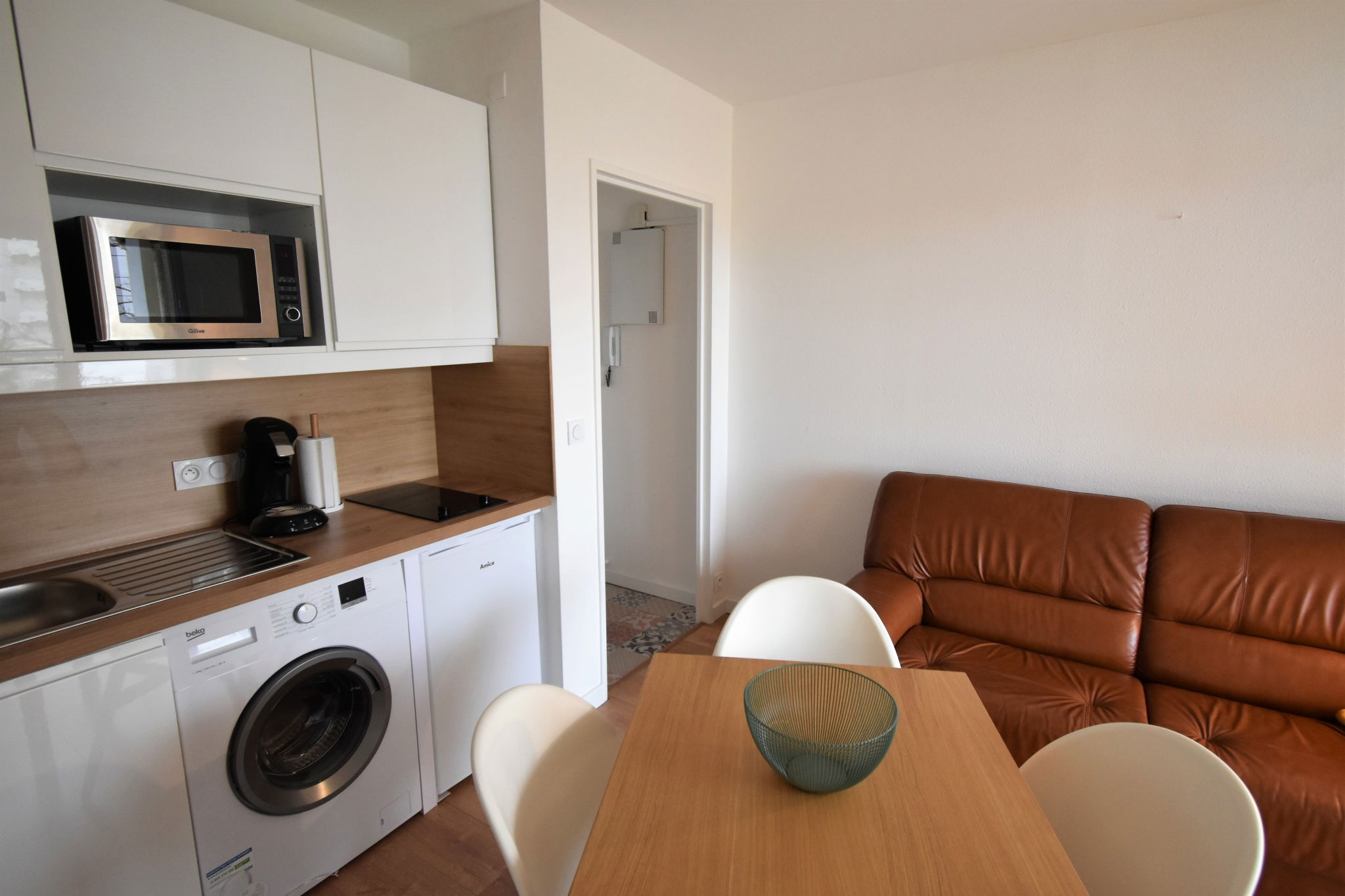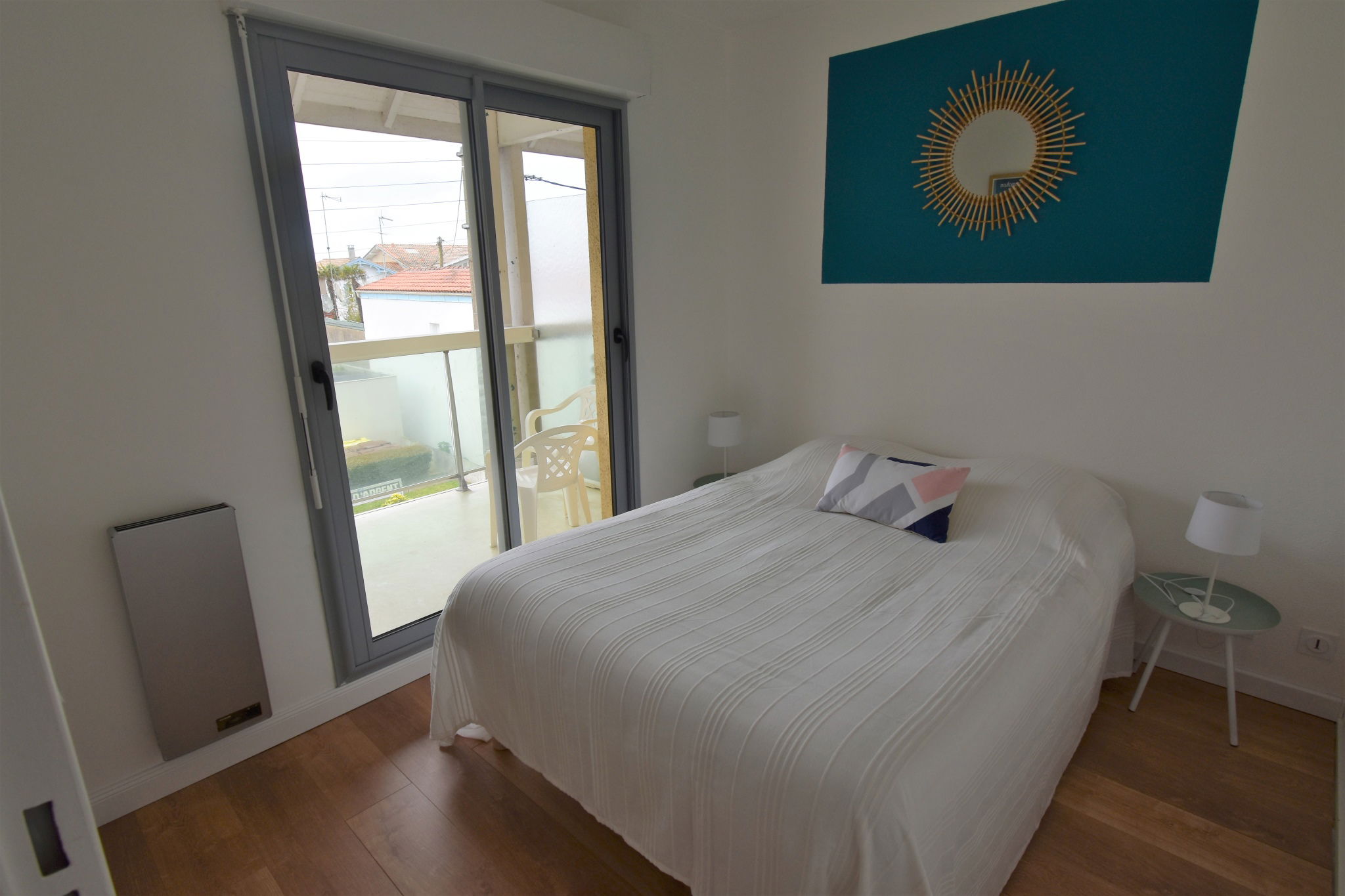 Arcachon, a stone's throw from the beach, the town center shops and its market, on the 2nd floor of a residence with lift, APARTMENT Appartement cabin completely renovated (winter 2020) of 29m2, with a living room (TV) with an equipped kitchen (washing machine, Senséo...) with balcony overlooking the street, a bedroom (140X200cm bed) on the balcony, a cabin (bunk beds), a small bathroom, a separate toilet. Possibility to park in the car park. Apartment offering all the comfort required to spend holidays on the basin, ideal for 1 couple with two children. Linen not provided, possibility of renting it via the agency, example: 1 pack of sheets + towels = 41€/week. Optional cleaning fee = 50€