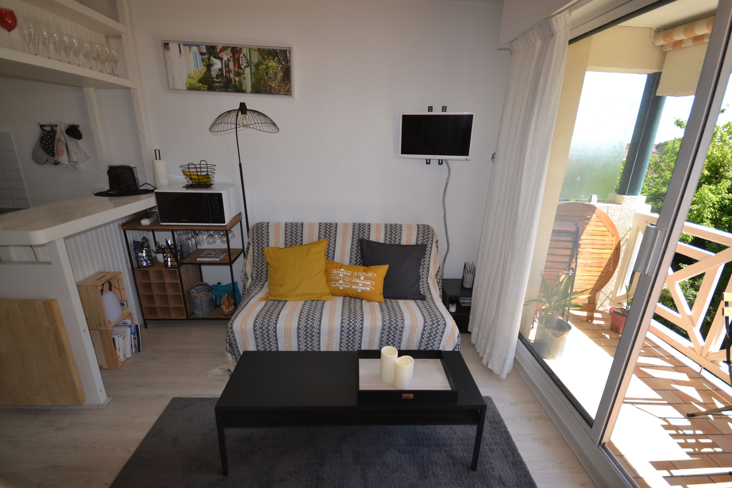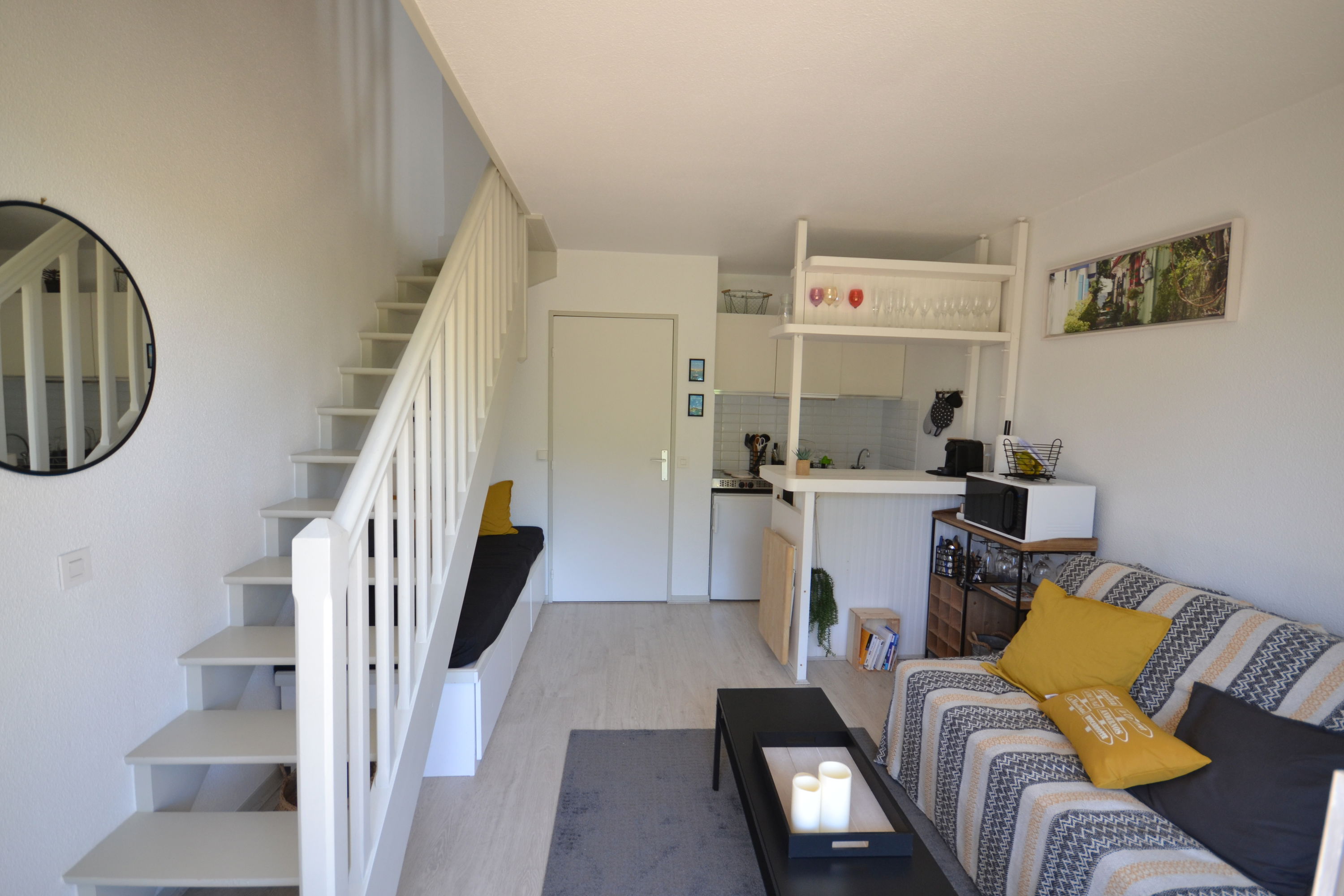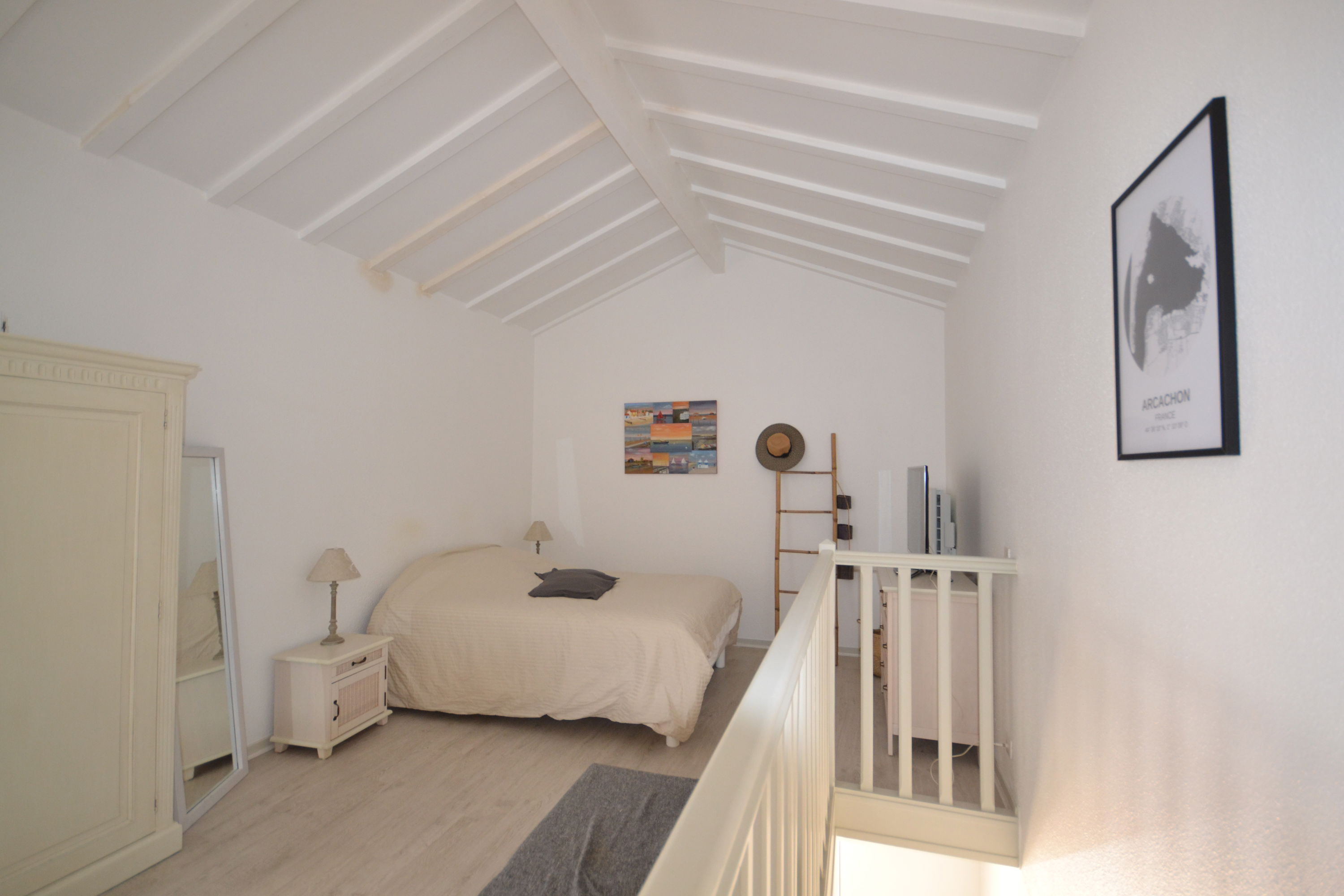 Arcachon - Petit Port / Saint-Ferdinand district - Direct access to the Port de Plaisance, 300m from Eyrac beach which has a wooden boardwalk on the sand leading to the town centre! Apartment of 38 m² on the top floor (elevator) offering a neat and warm decoration, comprising on the ground floor: - an entrance with a large cupboard - an equipped kitchen (washing machine, no dishwasher) with a bar area and a small side table attached to the bar -a living room that opens onto a balcony on the south side with a view of the Saint Ferdinand Church: sofa bed (140 cm), bench seat under the stairs, storage unit and shelf, TV, WIFI -a bathroom (bathtub, heated towel rail) Upstairs: stairway leading to a large bedroom (no connecting door, 140 cm bed, wardrobe, TV, fan). This room overlooks a beautiful terrace with a view of the pool. No private parking but possibility of parking vehicle in the small free streets located in front of the residence. A beautiful duplex Appartement to spend a great holiday in Arcachon, close to the beaches, the port, the market in the center of Aiguillon every Wednesday during the summer and its shops. Linen not provided, possibility of renting through the agency, eg: 1 pack of 160 cm sheets + towels = 41 Euros/week - 1 pack of 90 cm sheets + towels = 31 Euros/week. Optional cleaning fee 60 Euros Discovery of the natural environment of the Bassin d'Arcachon: the ports, the parks and the oyster huts, the source of the Abatilles, the beaches of the basin and the ocean beaches, the Dune du Pyla, the Landes forest, the lakes. Sports (equestrian center, golf, water sports, cycling, etc.) or cultural activities (commented tour of the Quartier de la ville d'hiver, workshops for children and adults at the MAAT, theatre, cinema, exhibitions, concerts..) are rich in Arcachon. We also recommend visiting the magnificent city of Bordeaux, easily accessible by train or car, and its vineyards.