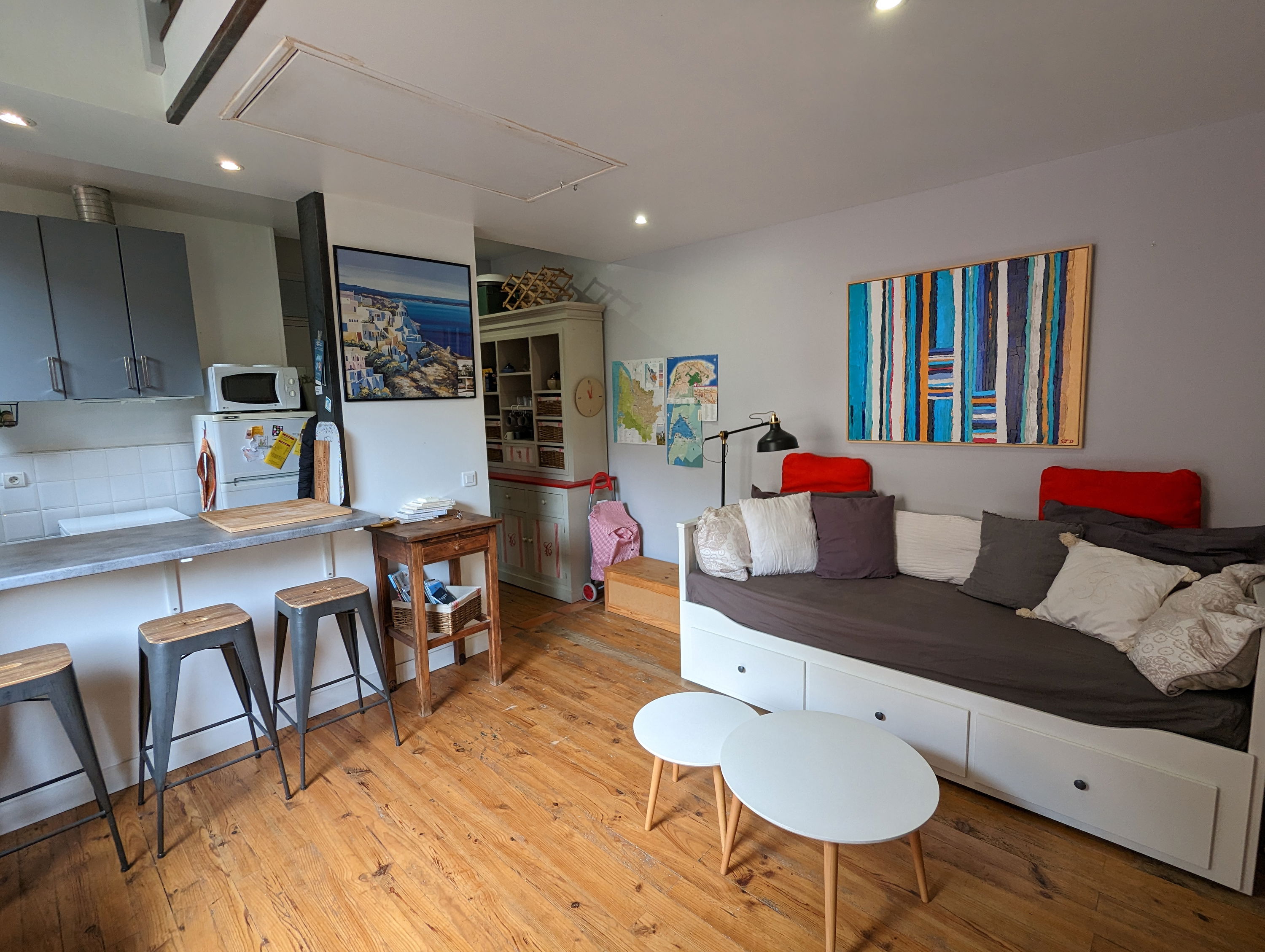 Arcachon - In the heart of the city center, everything is in the immediate vicinity: shops, beaches, market, restaurants, train station... In a small art-deco style residence, apartment of 38 m² on the 1st floor (no lift), for 4 people, facing East on the back of the residence so very quiet: An entrance, an open and equipped kitchen which overlooks the living room (washing machine, no dishwasher) with a bar separation and 4 stools (for taking meals), living area (games and books for children available, convertible sofa with 2 mattresses of 80cms, TV, WIFI), bathroom (WC, shower, 1 vanity unit, 1 hair dryer) , bedroom (140cms bed, closet and wardrobe). Baby equipment available: 1 high chair, 1 travel cot with mattress and mattress topper, 1 bath, 1 booster seat for the WC, 1 potty. No parking, no balcony and no terrace. Linen not provided, possibility of renting through the agency, eg: 1 pack of 160 cm sheets + towels = 42 Euros/week - 1 pack of 90 cm sheets + towels = 32 Euros/week. Optional cleaning fee 60 Euros Discovery of the natural environment of the Bassin d'Arcachon: the ports, the parks and the oyster huts, the source of the Abatilles, the beaches of the basin and the ocean beaches, the Dune du Pyla, the Landes forest, the lakes. Sports (equestrian center, golf, water sports, cycling, etc.) or cultural activities (commented tour of the Quartier de la ville d'hiver, workshops for children and adults at the MAAT, theatre, cinema, exhibitions, concerts..) are rich in Arcachon. We also recommend visiting the magnificent city of Bordeaux, easily accessible by train or car, and its vineyards.