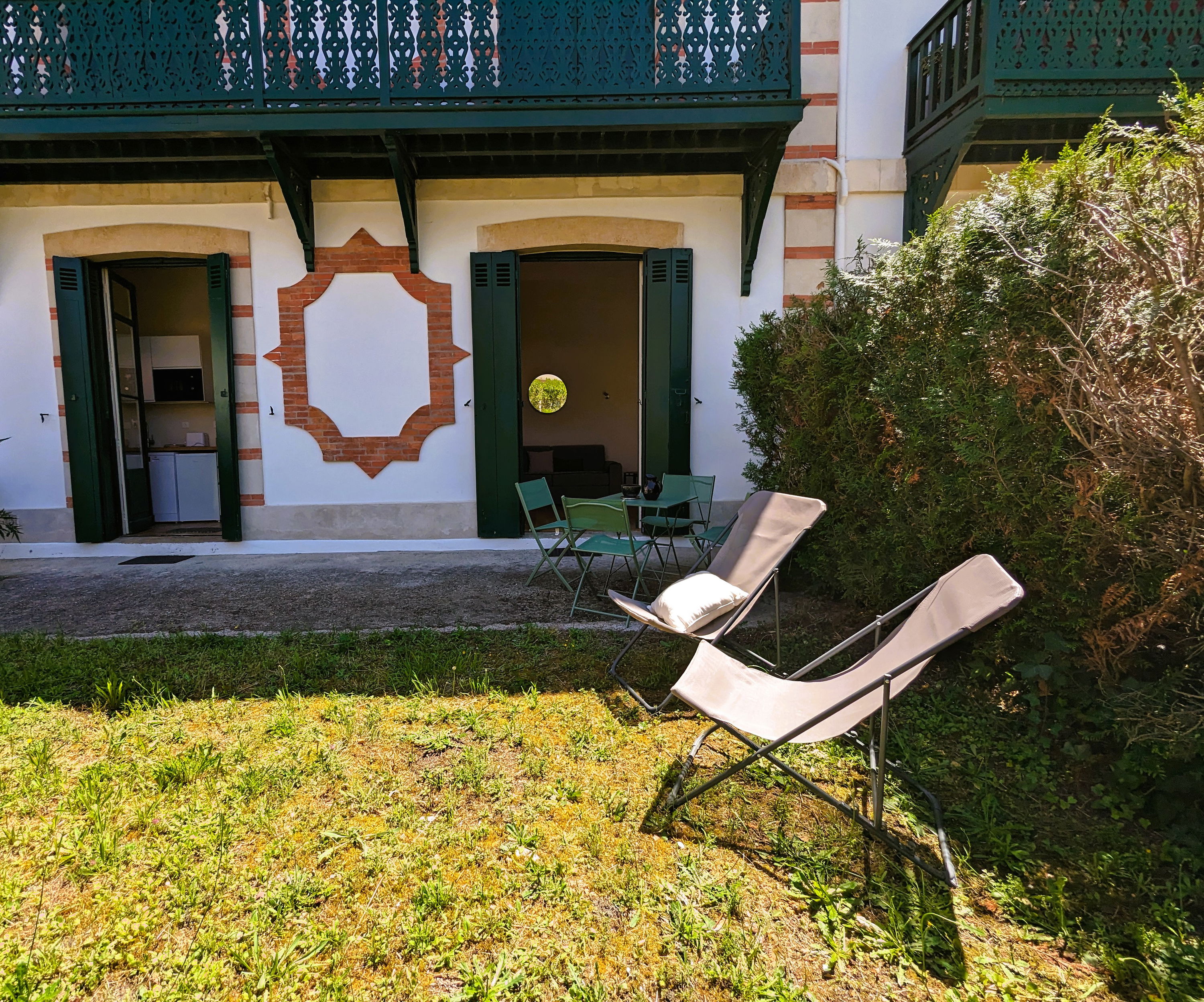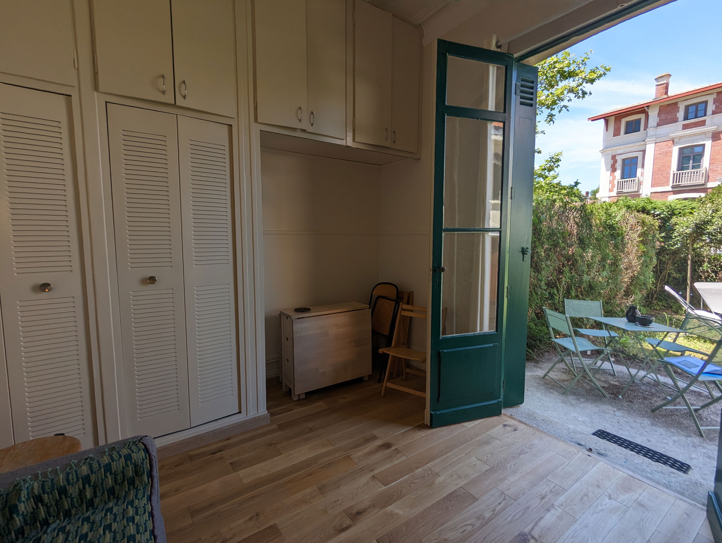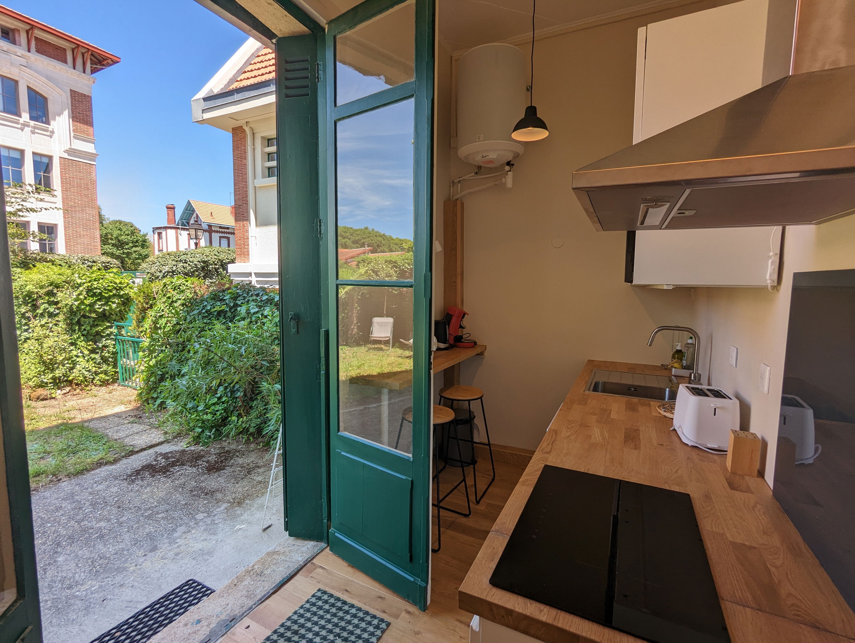 Arcachon - Ville d'Hiver district just next to the Parc Mauresque- 5 mins walk from the city center by taking the Parc Mauresque lift and close to the beaches. In a beautiful Arcachonnaise house, Studio of 27 m² living space on the ground floor, for 2 people, opening onto a quiet terrace and garden of 78 m²: - A small entrance, an equipped kitchen which opens onto the terrace with a high bar and 2 stools - A living room which opens onto the terrace and the garden: convertible sofa (sleeps 2 people), 2 bedside tables, 1 table with extension leaves and 4 chairs, no TV, large cupboard, shelf and wardrobe. -A bathroom: Italian shower, 1 washbasin with furniture (no hair dryer) and 1 WC, 1 secure and airy parking space, terrace and garden. An ideal studio to spend a great holiday in Arcachon. Linen not provided, possibility of renting some via the agency, eg: 1 pack of 160 cm sheets + towels = 42 Euros/week - 1 pack of 90 cm sheets + towels = 32 Euros/week. Optional cleaning fee 60 Euros