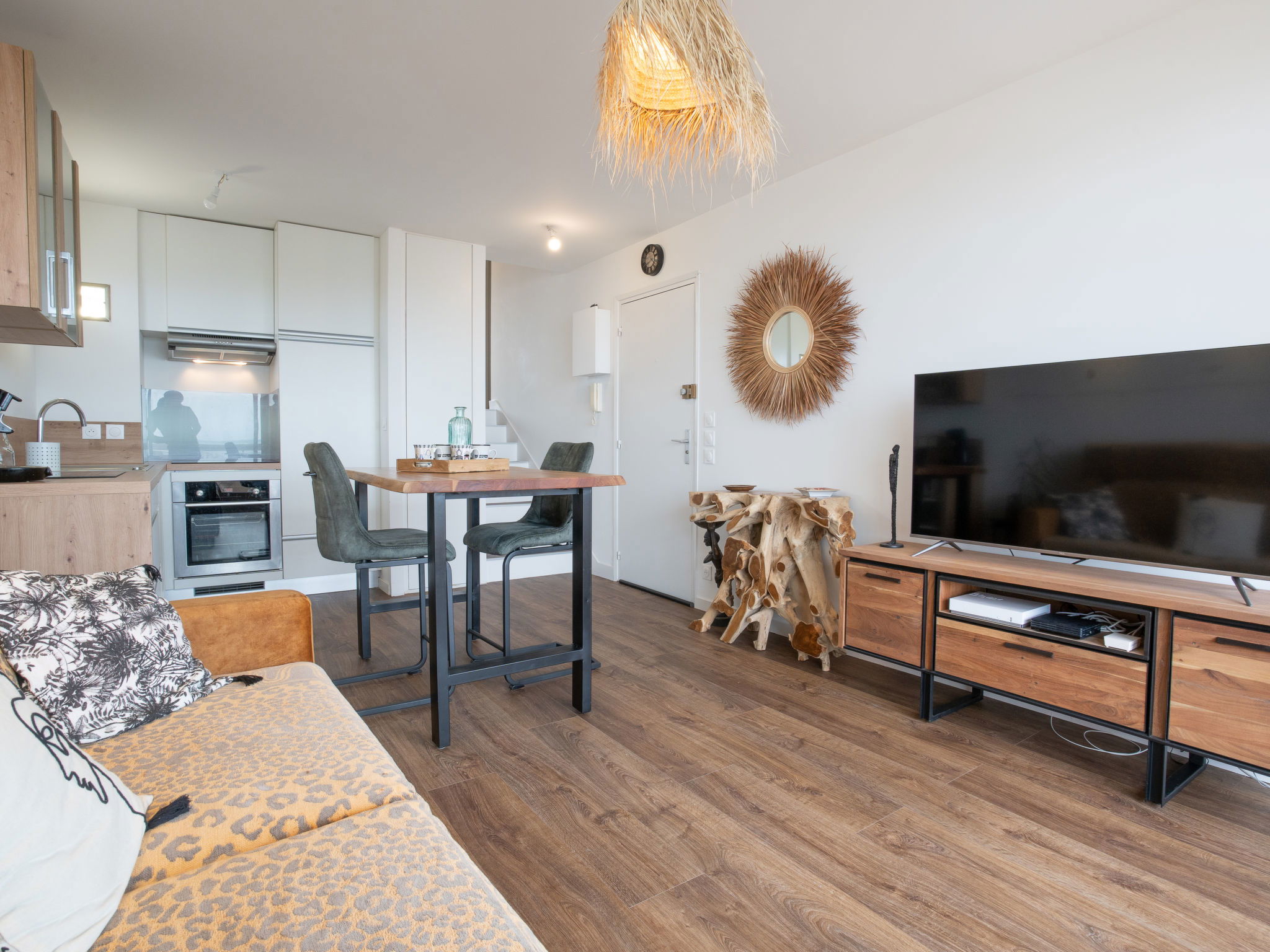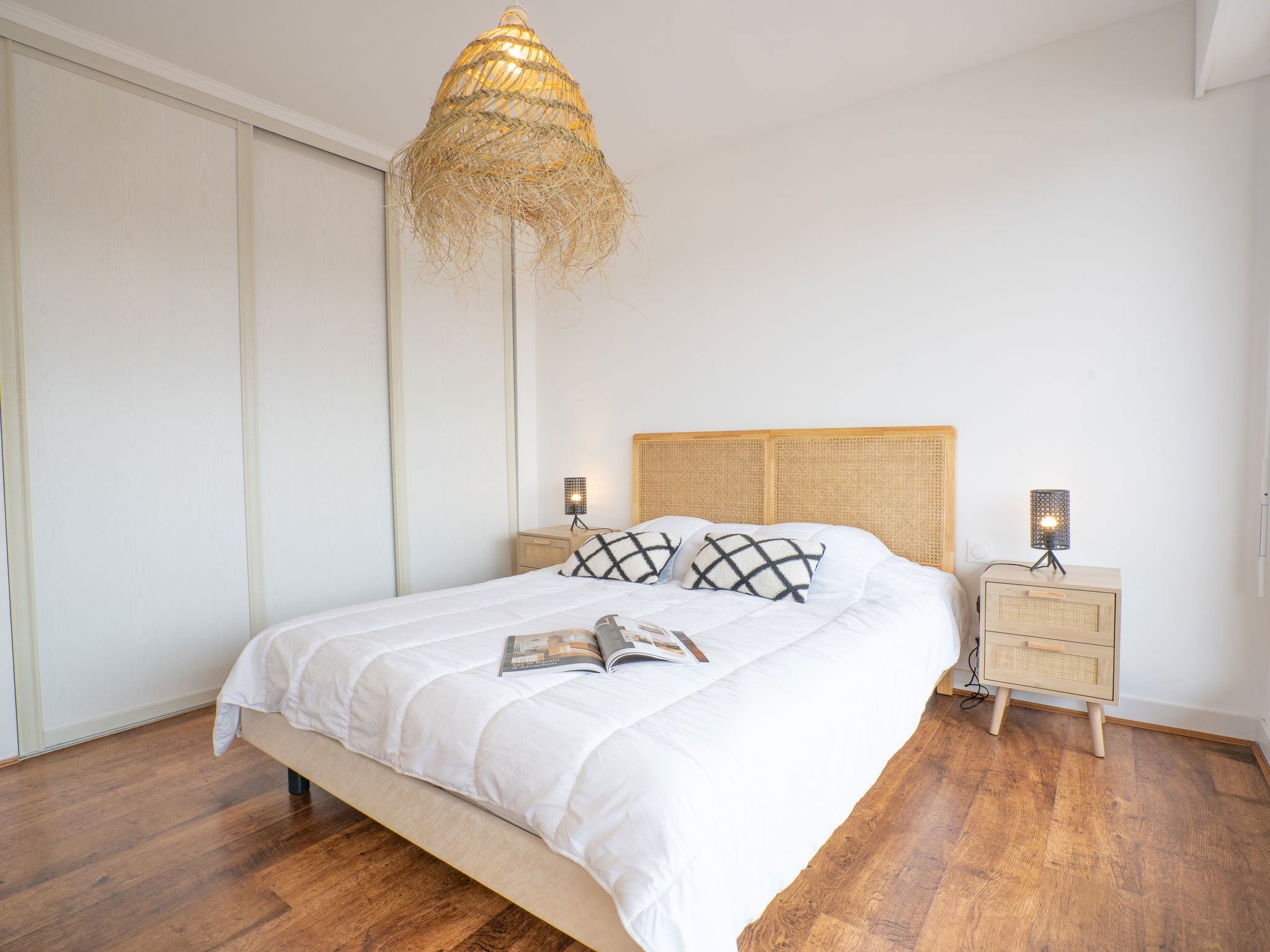 2-room apartment 45 m2 on 2 levels on 6th floor. Renovated in 2023, beautiful and tasteful furnishings: living/dining room with 1 double sofabed (1 x 140 cm, length 190 cm), TV (flat screen). Exit to the balcony, north facing position. Open kitchen (oven, 3 induction hot plates, toaster, kettle, microwave, electric coffee machine, Capsules for coffee machine (Senseo) extra). Upper floor: 1 room with 1 french bed (1 x 160 cm, length 200 cm). Exit to the balcony, south facing position. Shower/WC. Electric heating. Small balcony 5 m2, north facing position, small balcony 5 m2, south facing position. Balcony furniture. Very beautiful view of the sea. Facilities: washing machine, iron, hair dryer. Internet (WiFi, free). Parking space n 48 (1 car). Please note: smoke alarm. Offer by a private individual according to Art. 155, IV of CGI. 3300900086404
