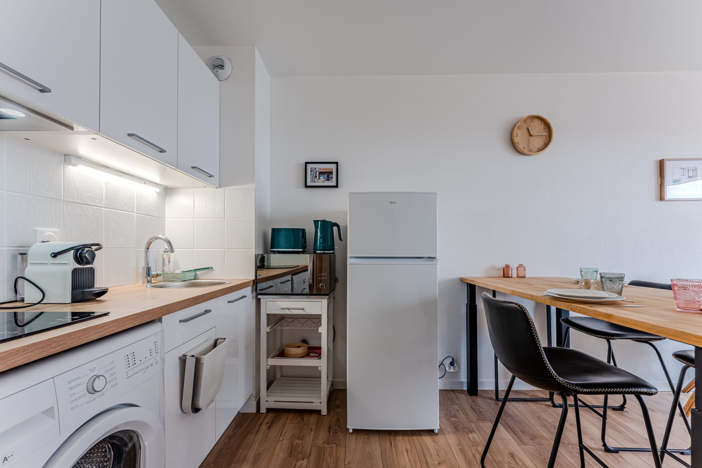 - a fully-equipped open kitchen (coffee machine, toaster, kettle, microwave oven, hob, fridge, freezer),
