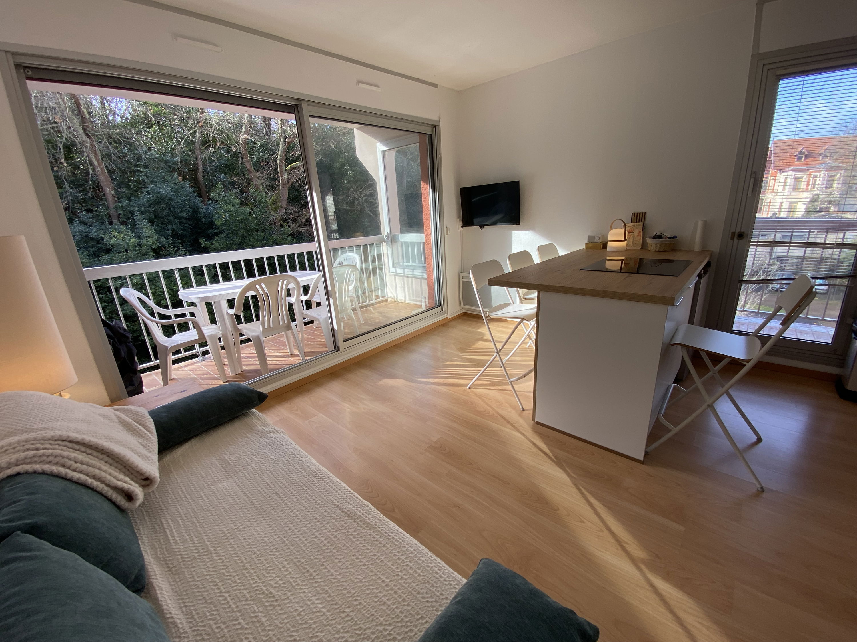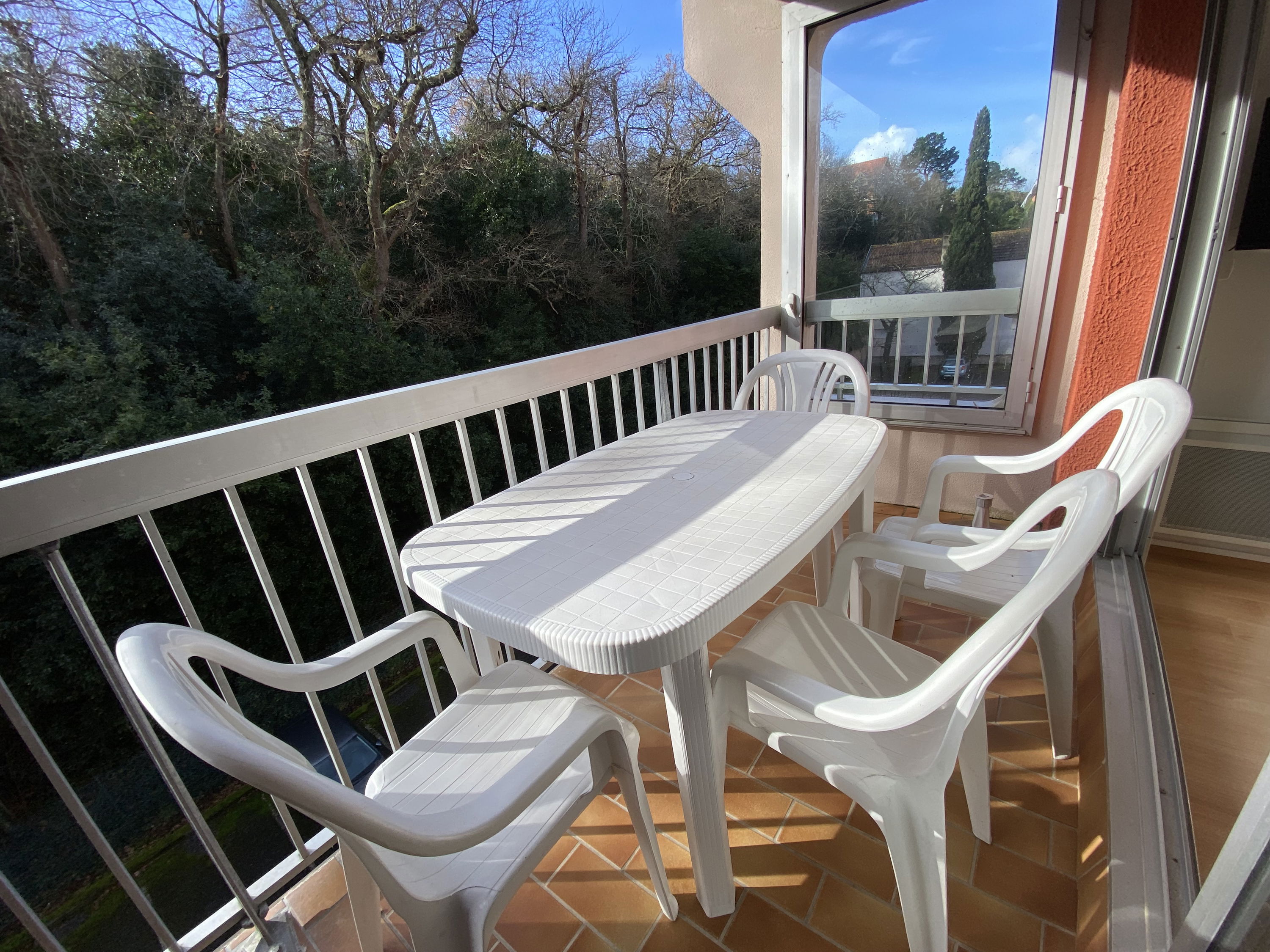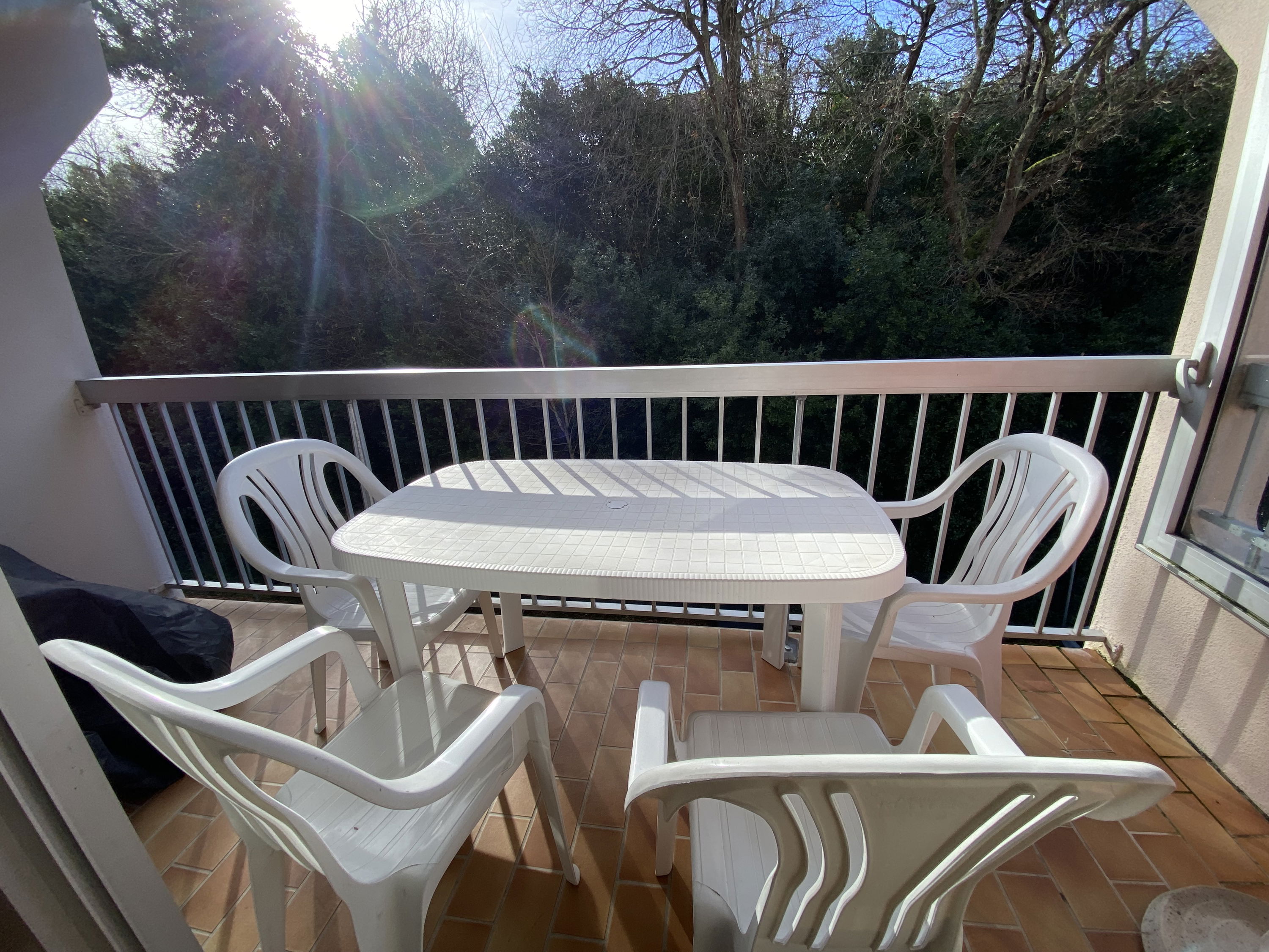 - Living room (TV) with 2-seater sofa bed (140x190), opening onto a south-facing balcony/terrace with furniture.
