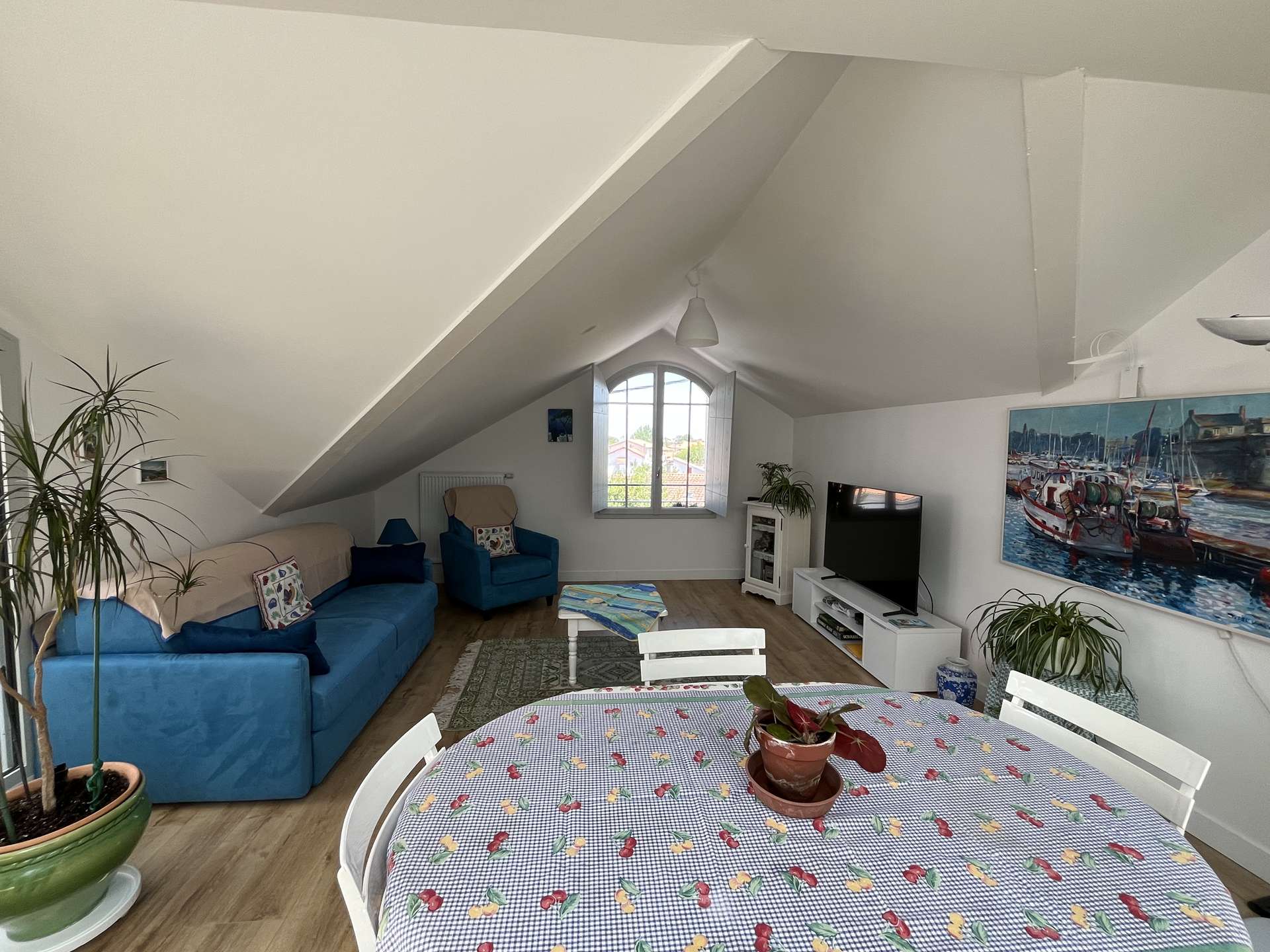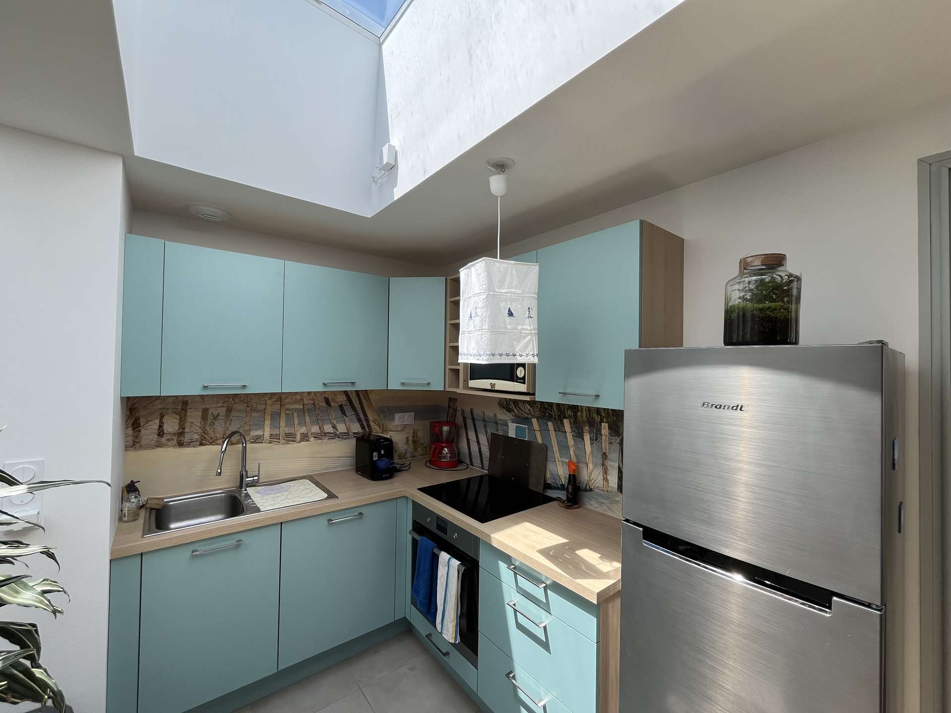 The spacious living area features a beautiful open kitchen (oven, dishwasher, 3-burner glass-ceramic stove, large fridge-freezer, microwave) and a comfortable living room, perfect for relaxing after a busy day.