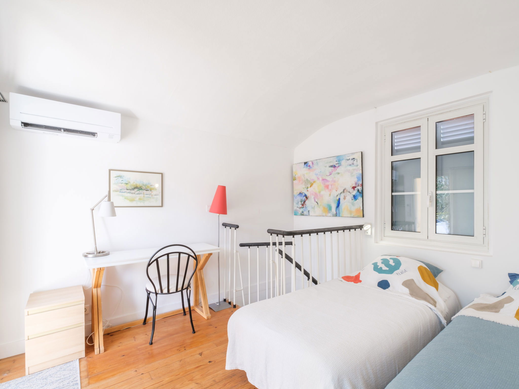 3-room house 62 m2 on 2 levels. Comfortable and beautiful furnishings: living/dining room with TV (flat screen), radio and air conditioning. Exit to the terrace. 1 room with 1 french bed (1 x 180 cm). Open kitchen (oven, dishwasher, 4 ceramic glass hob hotplates, toaster, kettle, microwave, freezer, electric coffee machine, Capsules for coffee machine (Nespresso) extra) with bar. Shower/WC. Upper floor: (spiral staircase), 1 room with 2 beds (90 cm, length 190 cm), shower and air conditioning. Exit to the balcony. Electric heating. Terrace 20 m2, south facing position. Terrace furniture, barbecue, deck chairs (1). Facilities: washing machine, iron, baby cot, hair dryer. Internet (WiFi, free). Please note: smoke alarm. Offer by a private individual according to Art. 155, IV of CGI. 33009002282B6