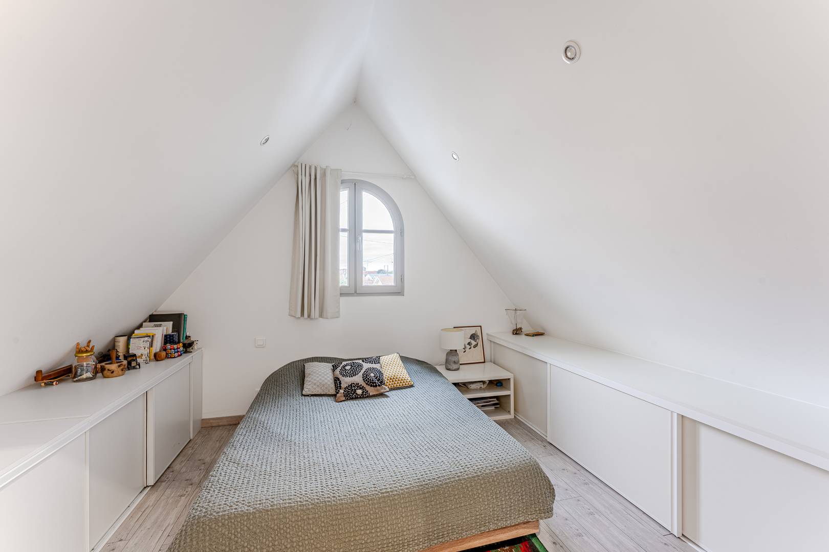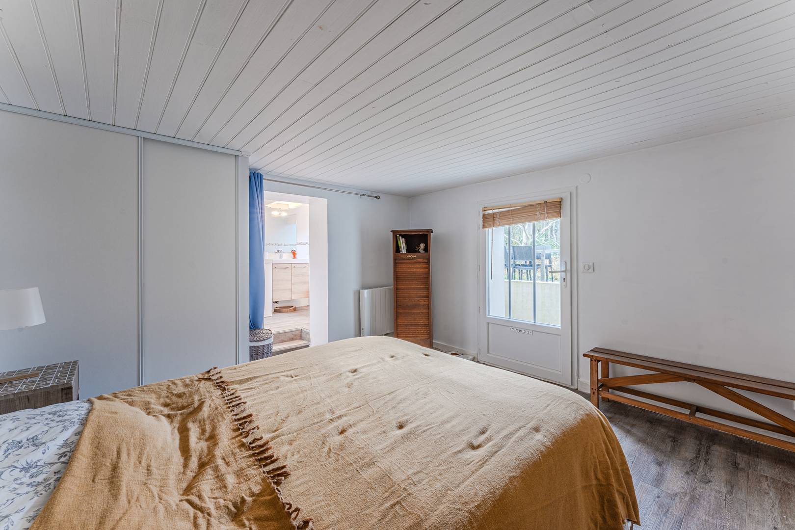 Upstairs, the landing leads to a bedroom facing east, with a double bed (140 cm) and a closet, as well as a shower room with WC and a second bedroom facing north, lit by a Velux, also with a double bed (140 cm) and a closet. On the garden level, accessible from the outside, there is a master suite comprising a bedroom with a double bed (140 cm) and a bathroom with macerator.