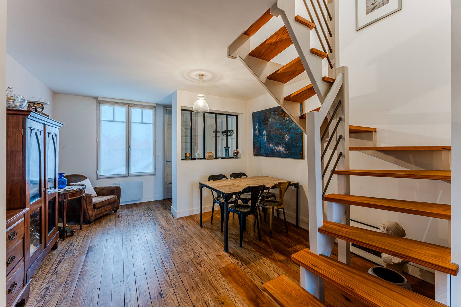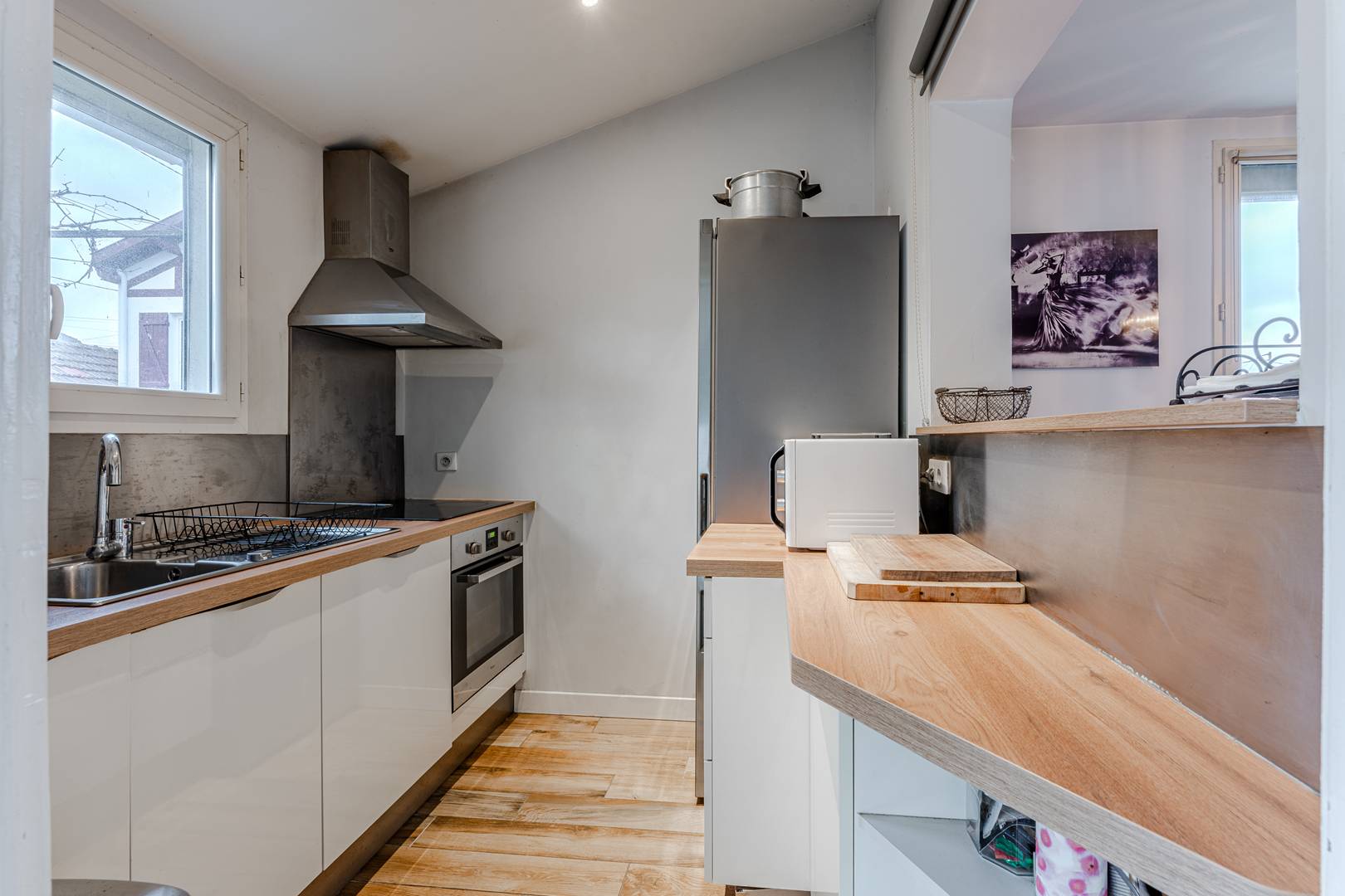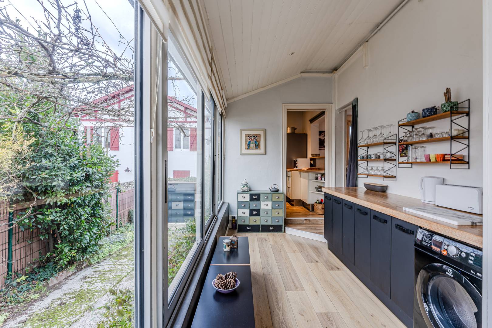 On the ground floor, an entrance leads to a dining room and a bright living room facing west, offering a lovely view of the garden. The fully equipped kitchen (fridge-freezer, induction hob, extractor hood, microwave, oven, dishwasher) is accompanied by a glazed back kitchen which opens onto a private passage to the garden, ideally fitted out with storage and washing machine. A storage cupboard and separate toilet complete this space.