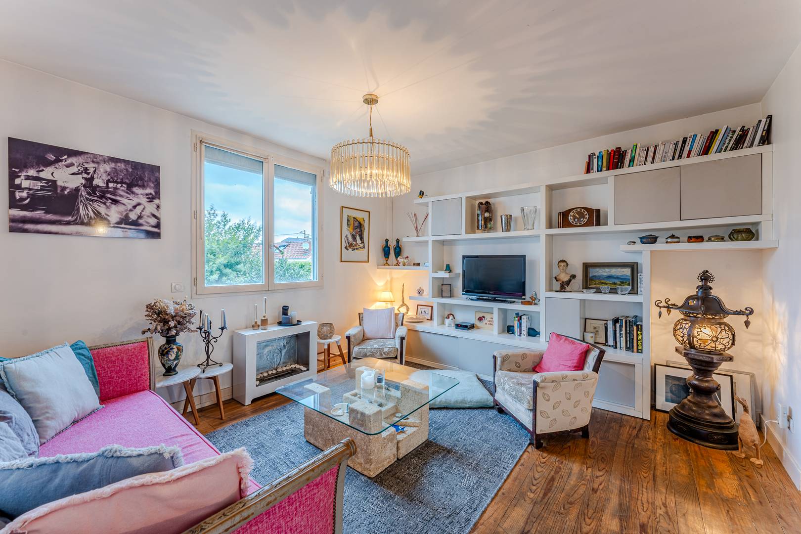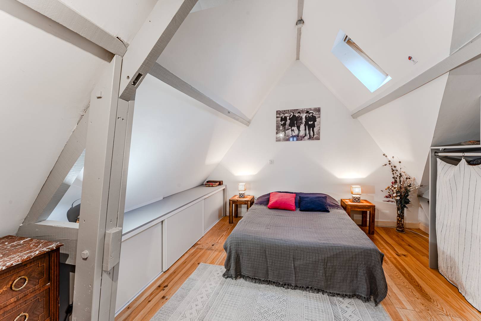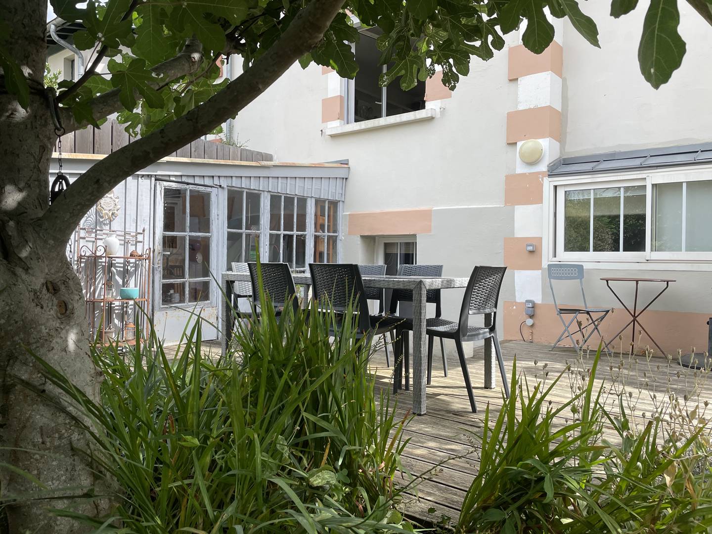 On the ground floor, an entrance leads to a dining room and a bright living room facing west, offering a lovely view of the garden. The fully equipped kitchen (fridge-freezer, induction hob, extractor hood, microwave, oven, dishwasher) is accompanied by a glazed back kitchen which opens onto a private passage to the garden, ideally fitted out with storage and washing machine. A storage cupboard and separate toilet complete this space.