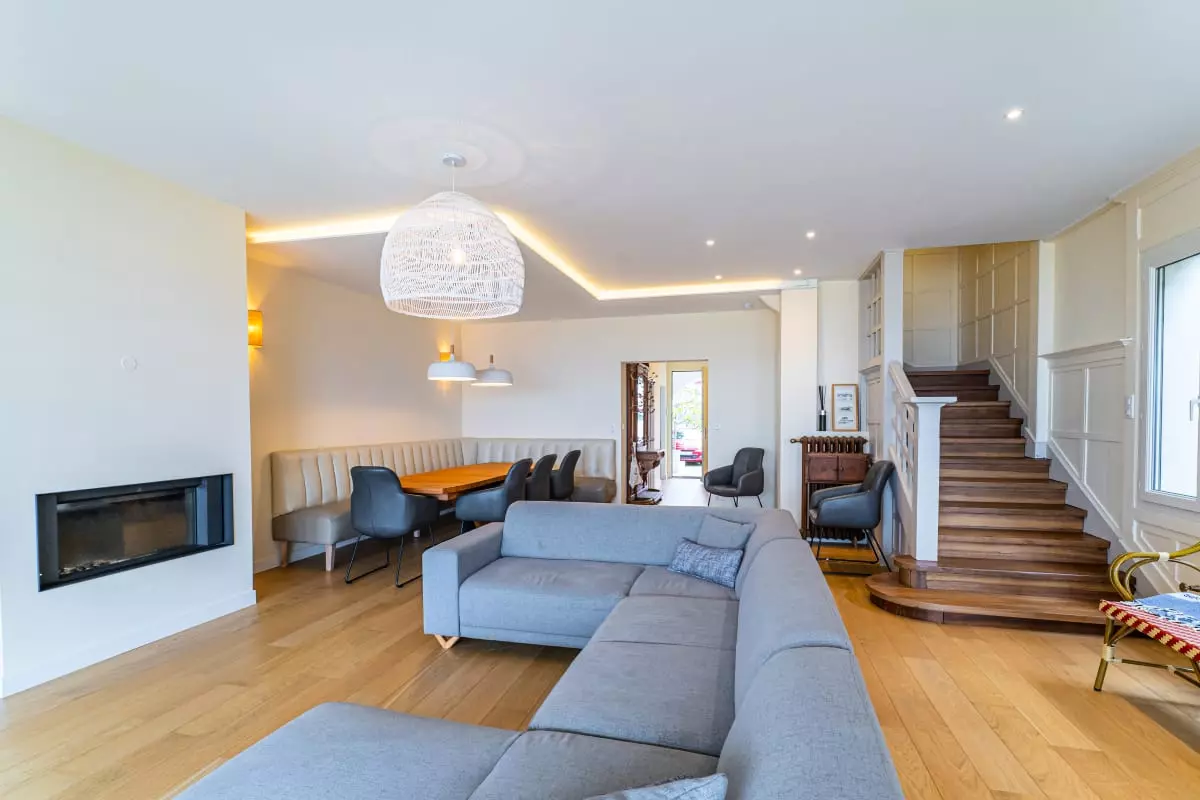 Enter the villa on the ground floor, where you'll find the entrance hall, laundry room, and separate toilet. You'll then arrive in the fully renovated and fully equipped kitchen, offering everything you need to cook to your heart's content. Next comes the spacious and bright 55m² living room, fully facing the beach and the private terrace, which also boasts a sea view.