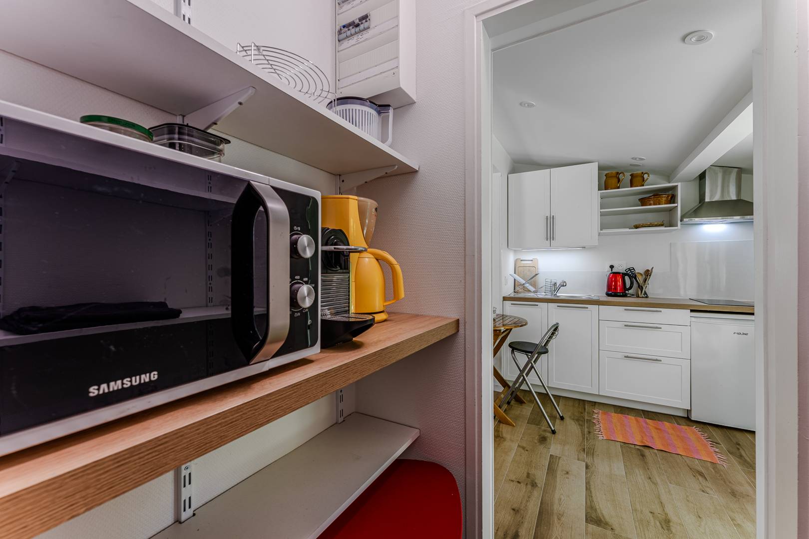Upon entering, you will discover a functional kitchen (2-burner induction hob, small refrigerator and extractor hood). A well-designed hallway offers storage shelves, a microwave and a Nespresso coffee machine, and leads to a bathroom with toilet and washing machine. The main room is well-appointed: On one side, a sleeping area accommodates a double bed (140) and a wardrobe; on the other, a lounge area composed of two armchairs and a television opens onto a covered terrace equipped with garden furniture and deckchairs. This overlooks a small south-facing garden, perfect for enjoying sunny days. A second small garden is also located at the front of the rental (East), offering a green setting upon arrival. Parking is easily available on the street. The complex is modest but very well maintained, and offers a good level of equipment for a pleasant stay just a stone's throw from the sea. The location is particularly appreciable: the beach is only 400 meters away, a grocery store is a 5-minute walk, and the town center with its shops (Monoprix) is about ten minutes away. Pets are not allowed. White linen is not provided, but it is possible to rent it through our partner LocLinge (promo code: vacances33). Cancellation insurance is included (optional membership). Departure cleaning is included, following normal and regular maintenance of the rental during the stay.