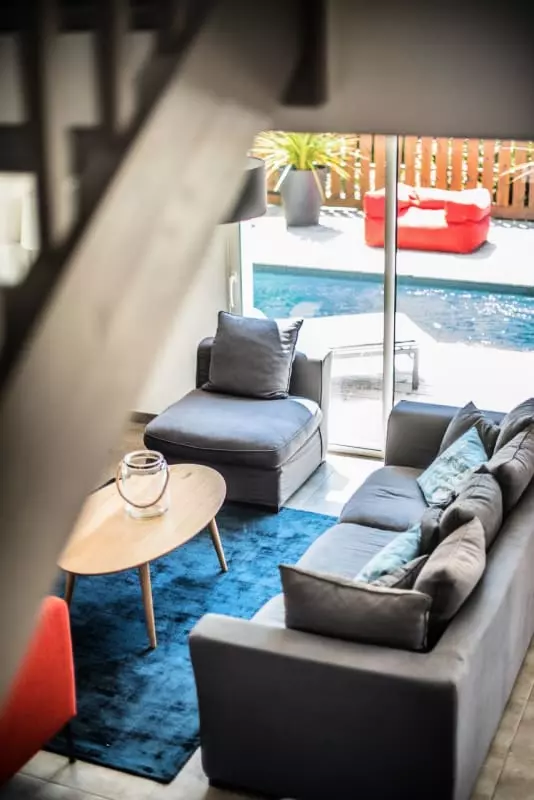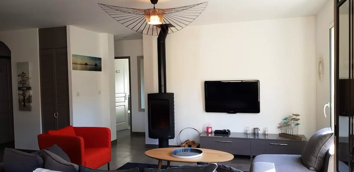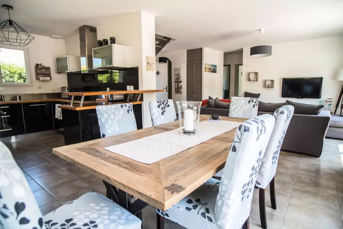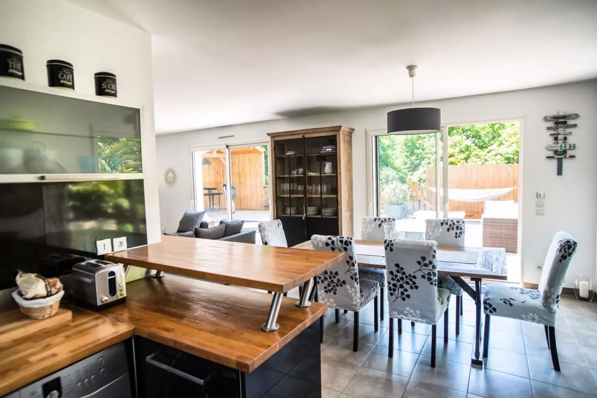 The living/dining room area opens harmoniously onto a fully equipped open kitchen, offering a direct view onto the wooden terrace with a dining area: aperitif, electric plancha and several deckchairs.