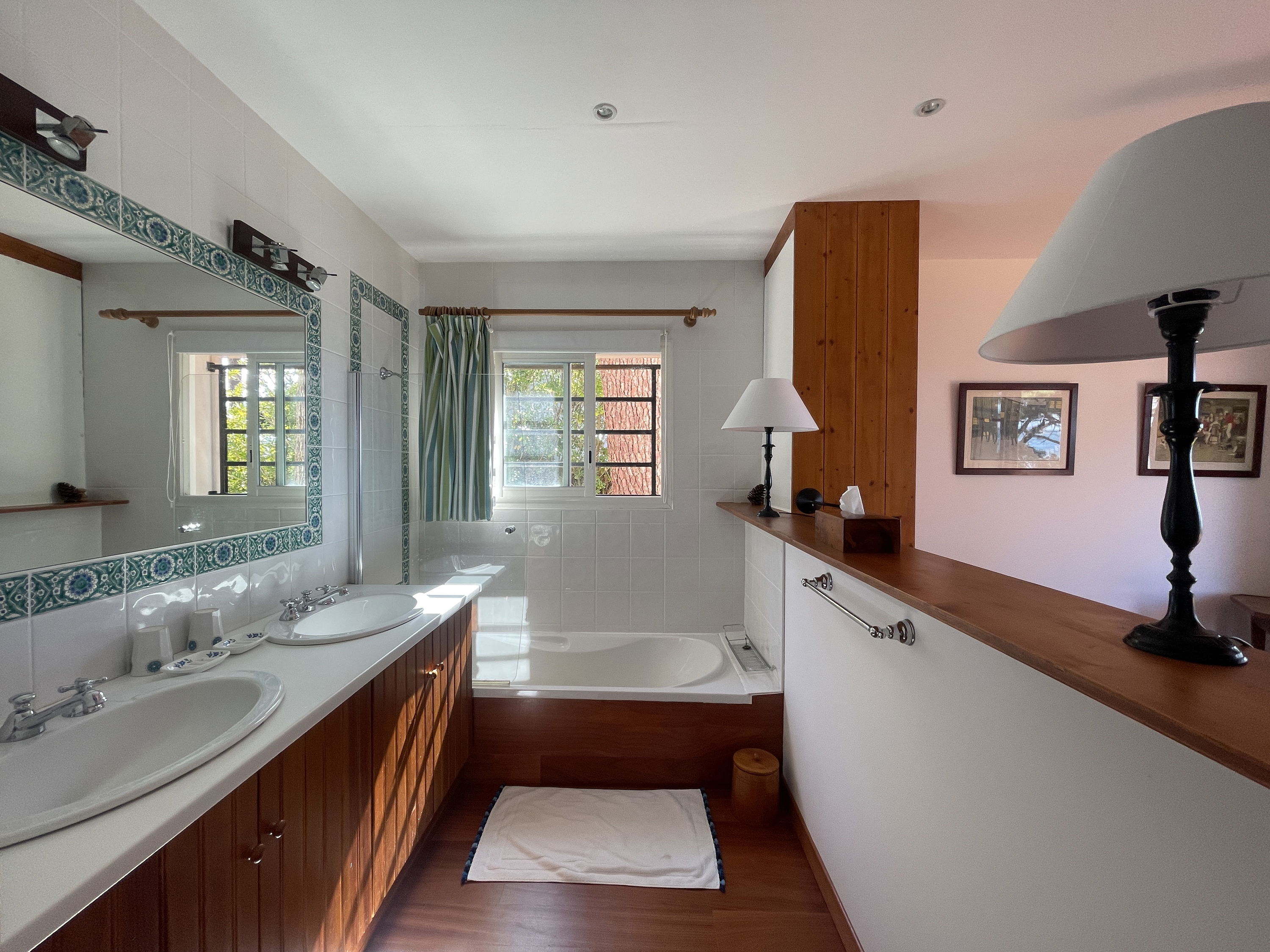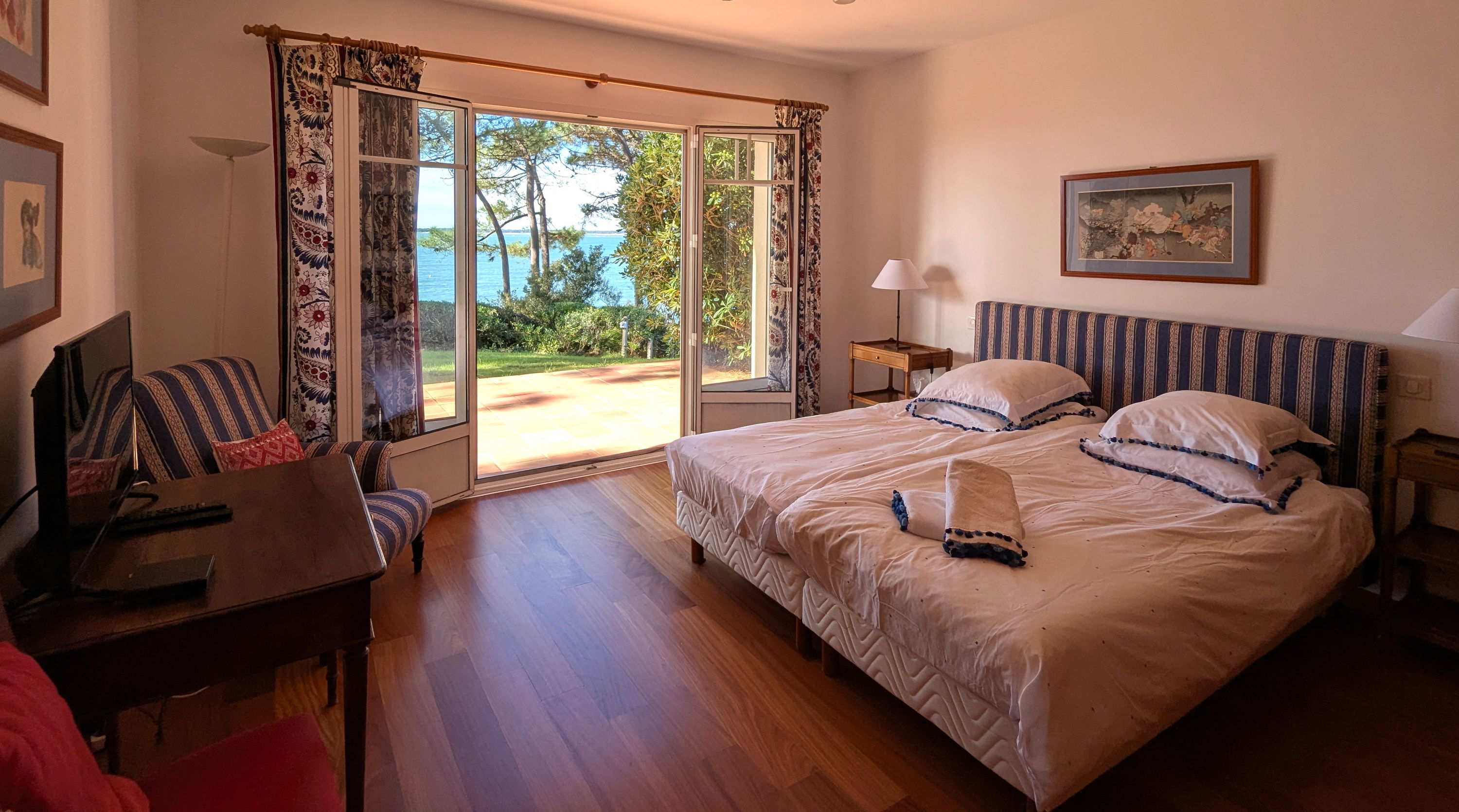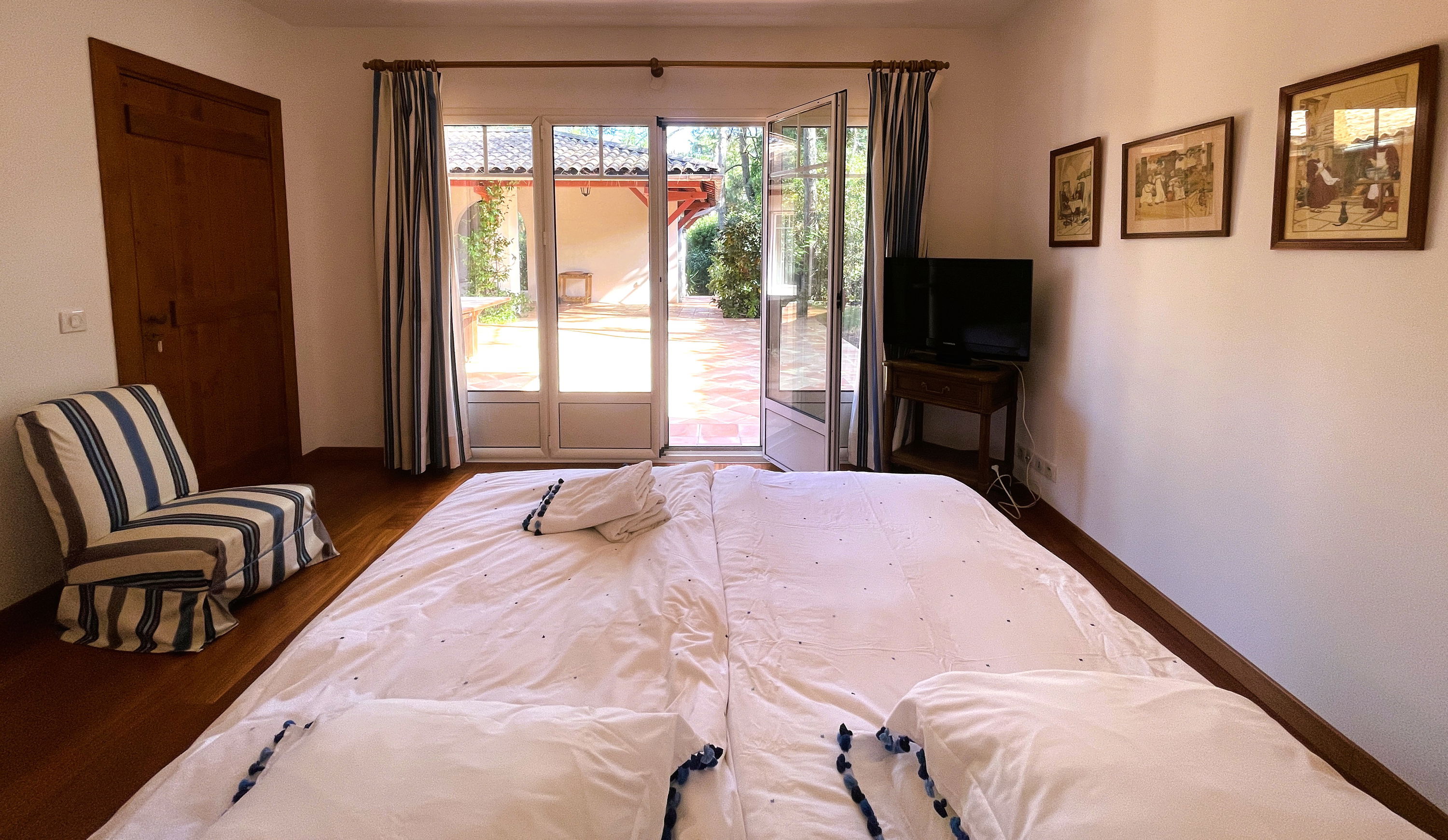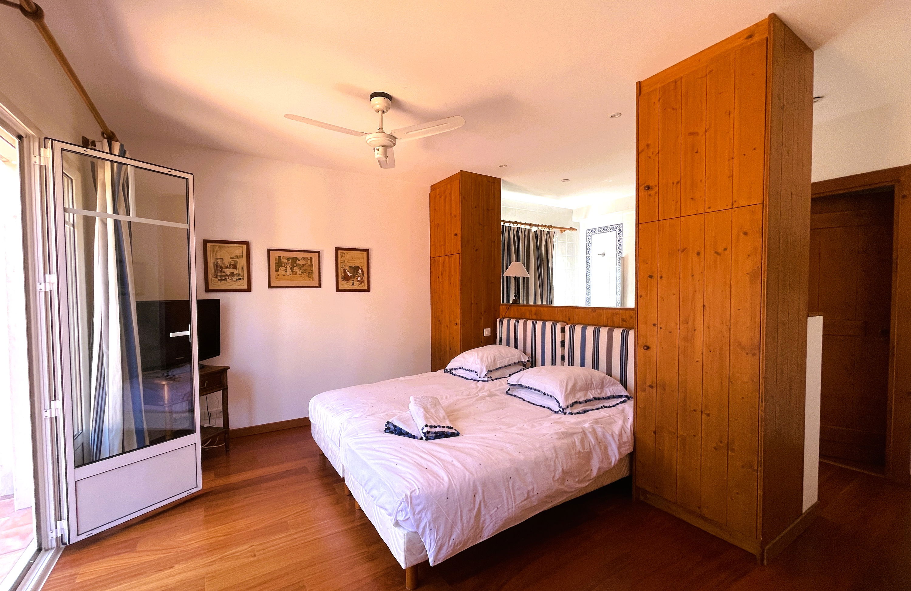 Upstairs: a TV and reading lounge area with a balcony overlooking the patio, a bedroom (120x190cm bed, wardrobe), a master suite consisting of a large bedroom and living room facing the pool (2 twin beds 80x190cm), dressing room, bathroom (bath with view, shower, double sink, WC).