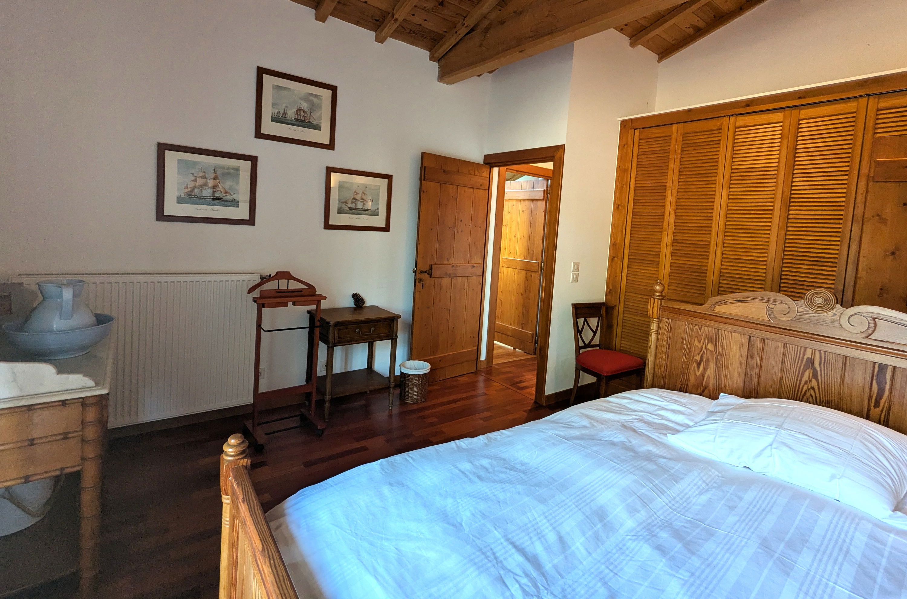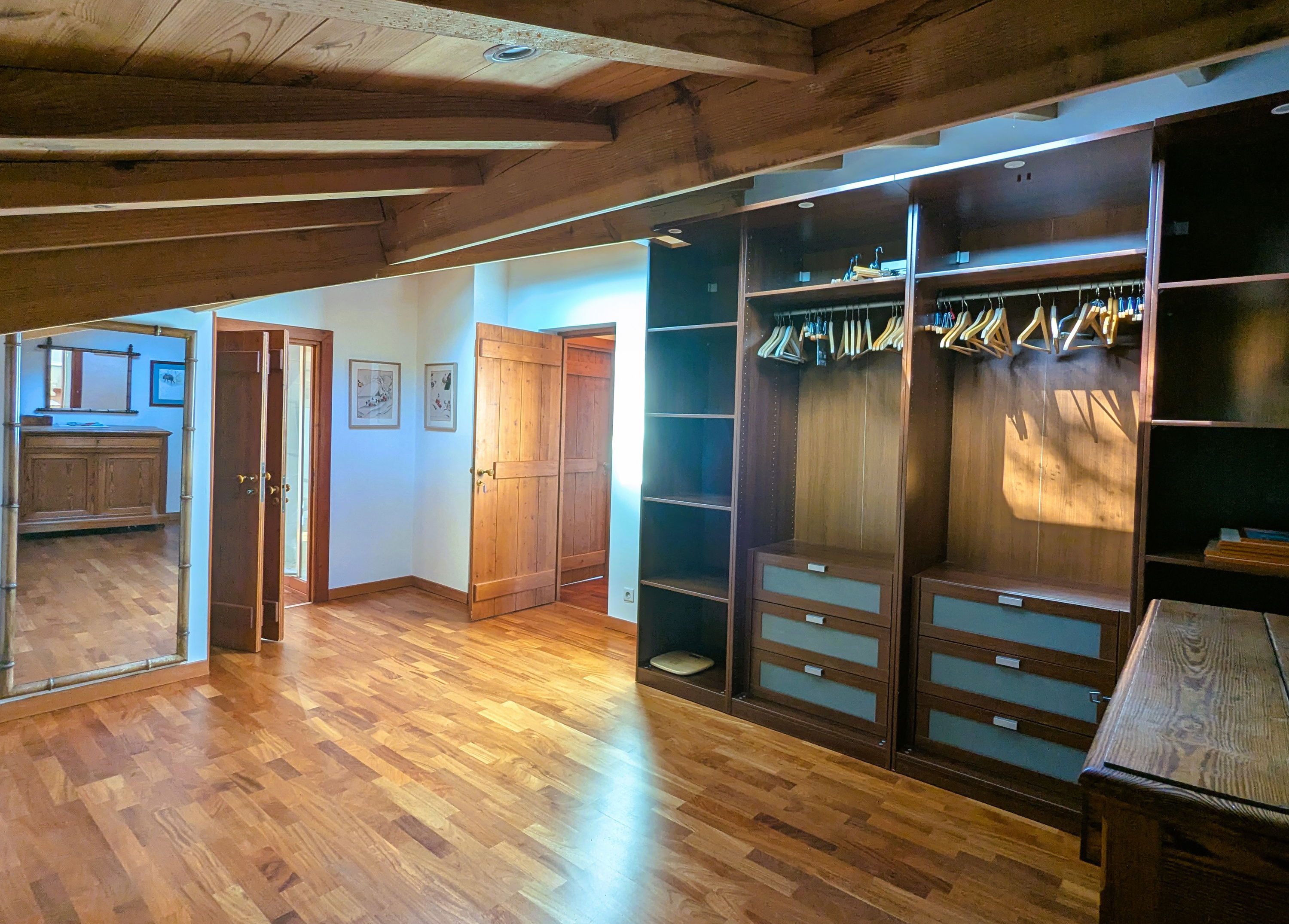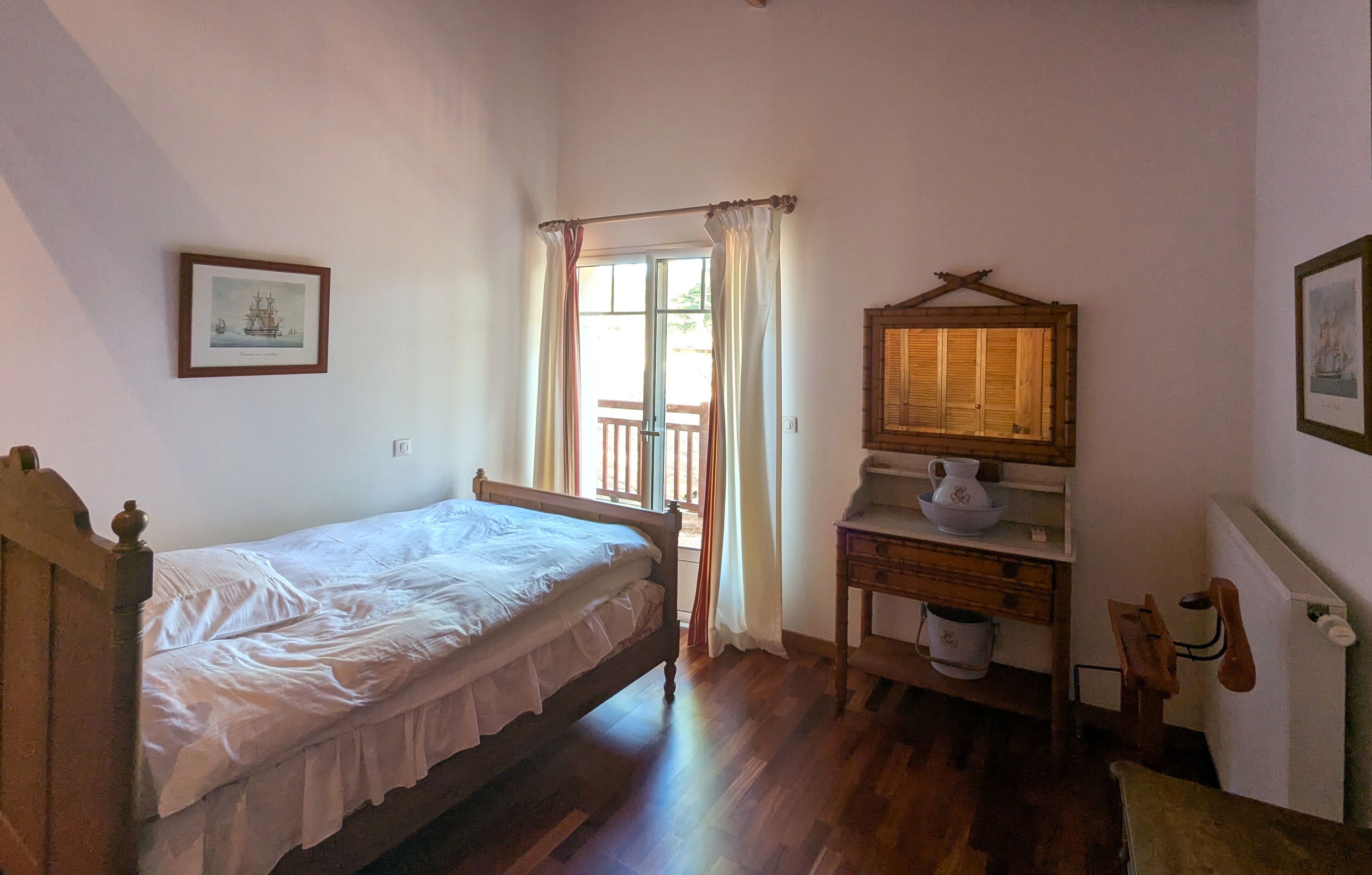 Upstairs: a TV and reading lounge area with a balcony overlooking the patio, a bedroom (120x190cm bed, wardrobe), a master suite consisting of a large bedroom and living room facing the pool (2 twin beds 80x190cm), dressing room, bathroom (bath with view, shower, double sink, WC).