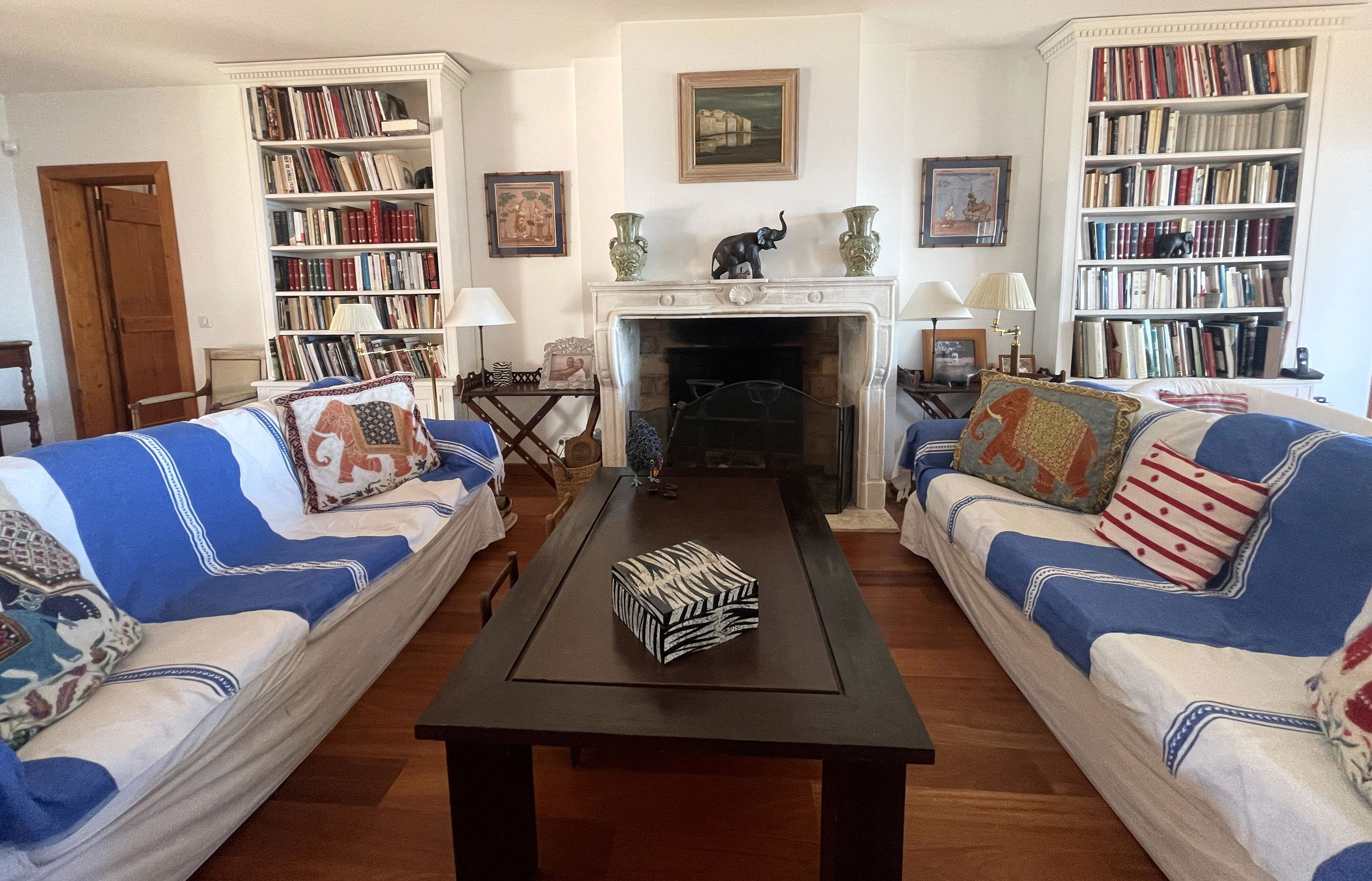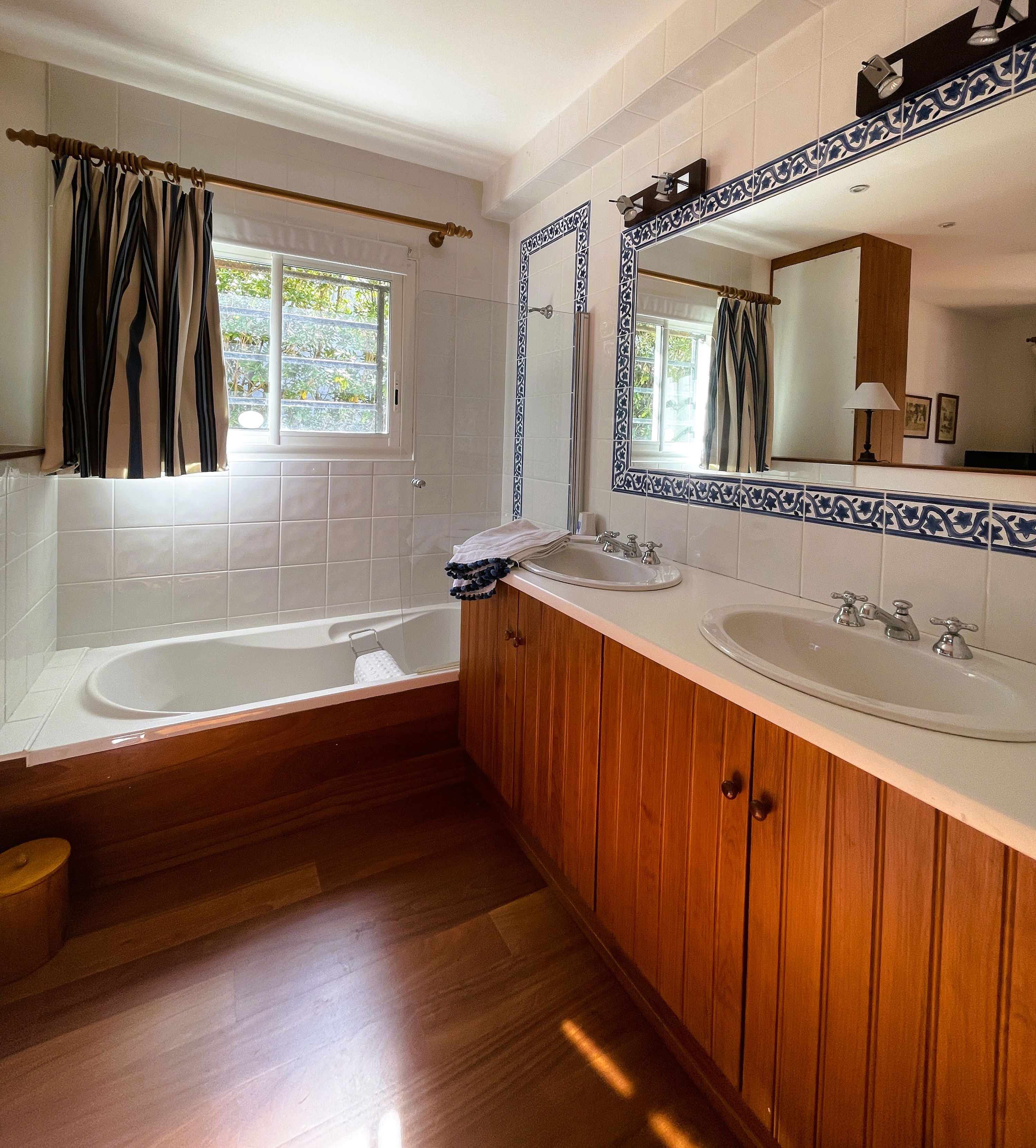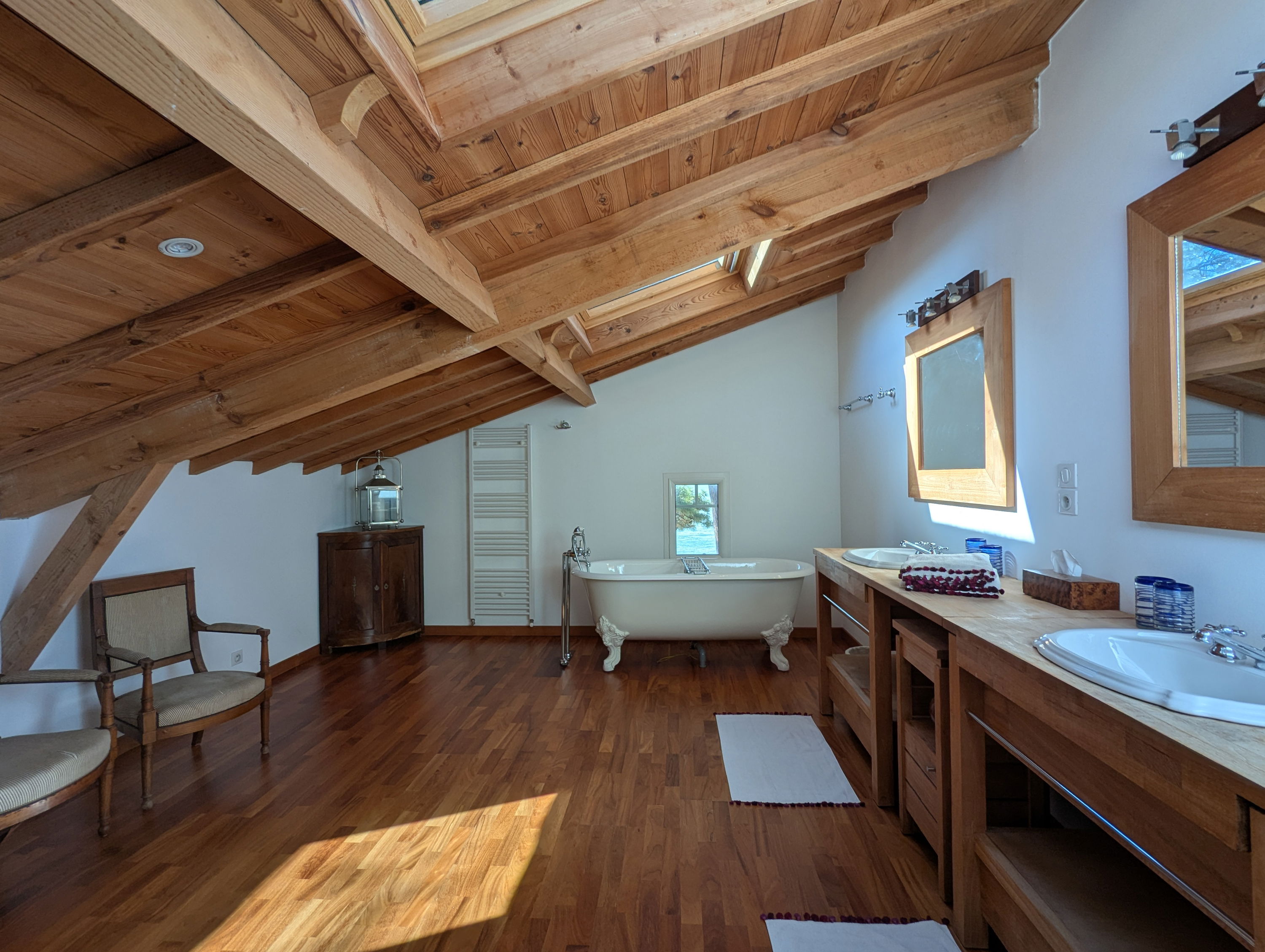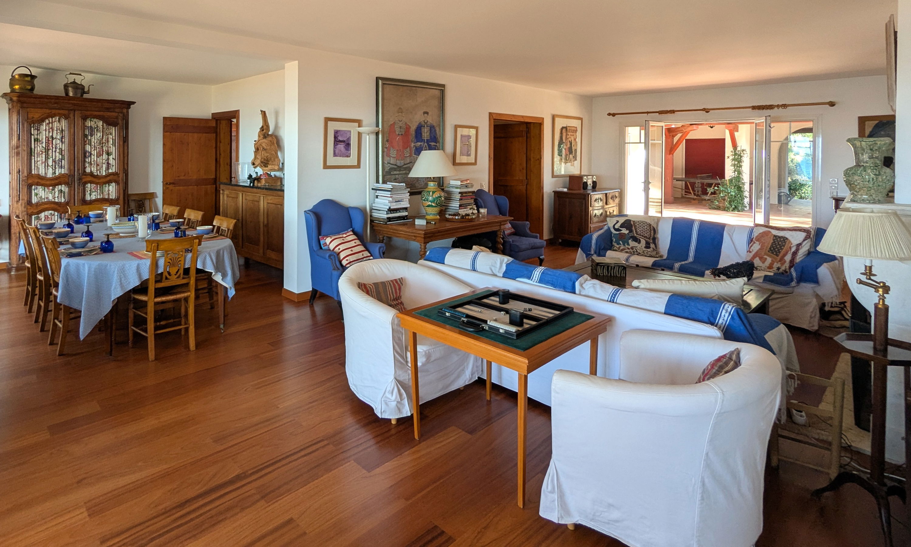 Upstairs: a TV and reading lounge area with a balcony overlooking the patio, a bedroom (120x190cm bed, wardrobe), a master suite consisting of a large bedroom and living room facing the pool (2 twin beds 80x190cm), dressing room, bathroom (bath with view, shower, double sink, WC).