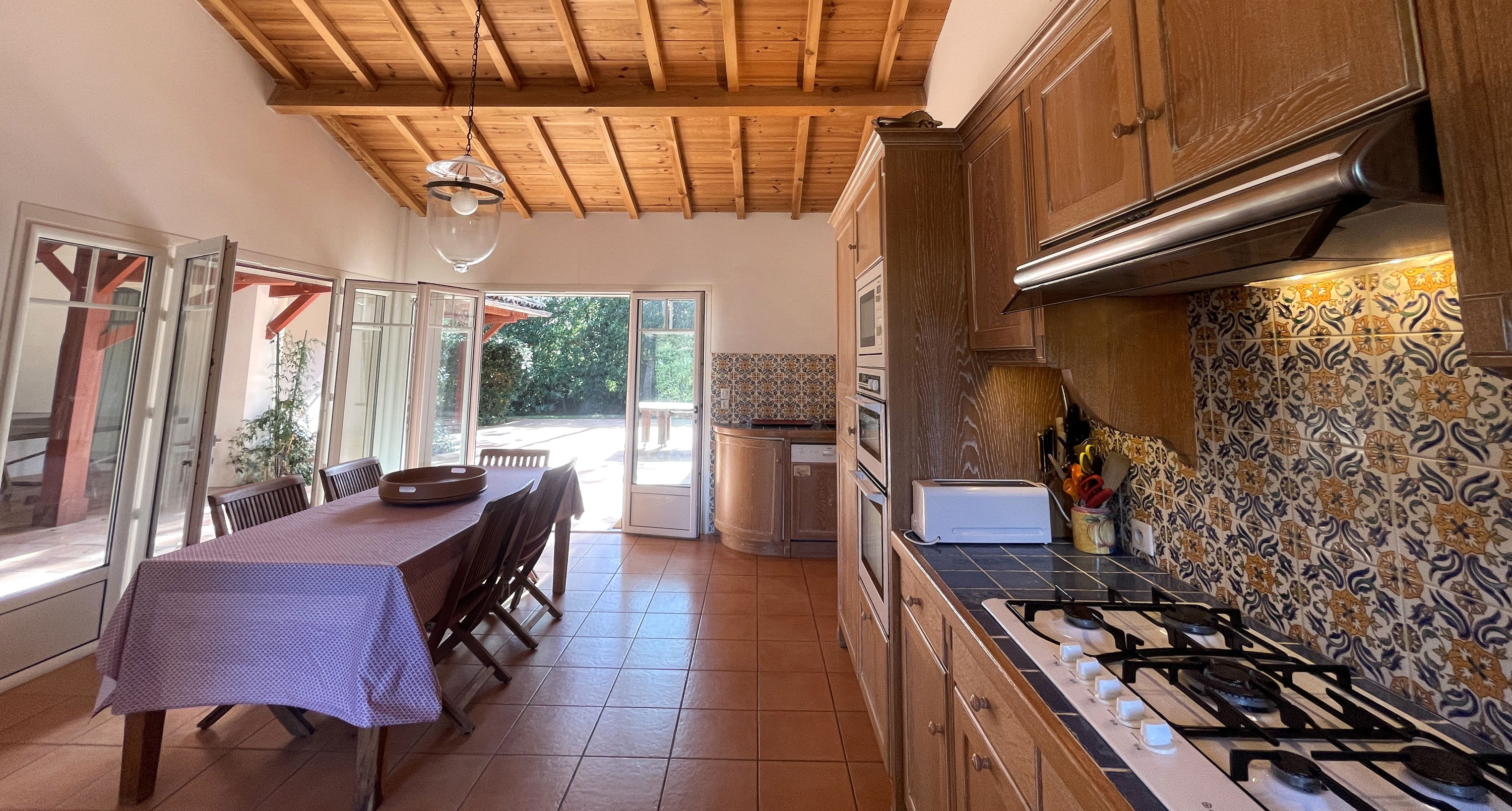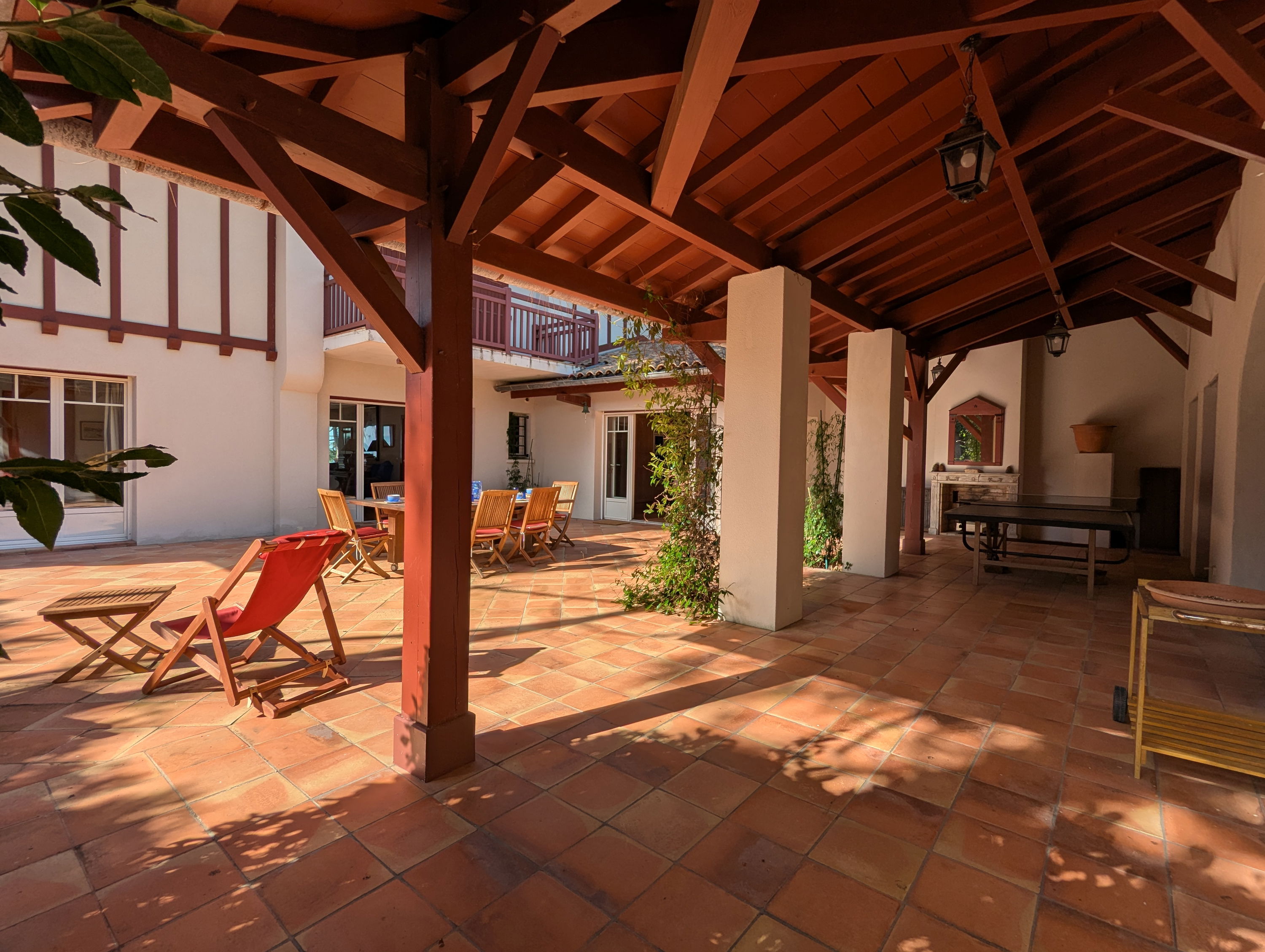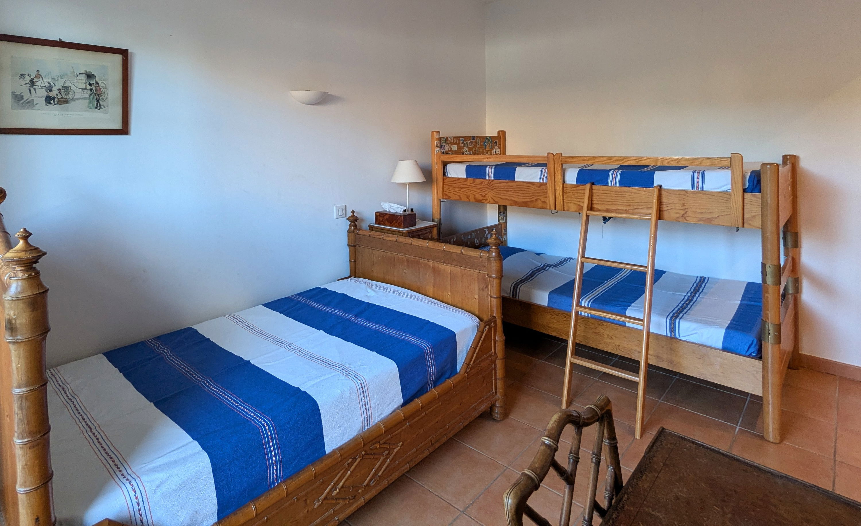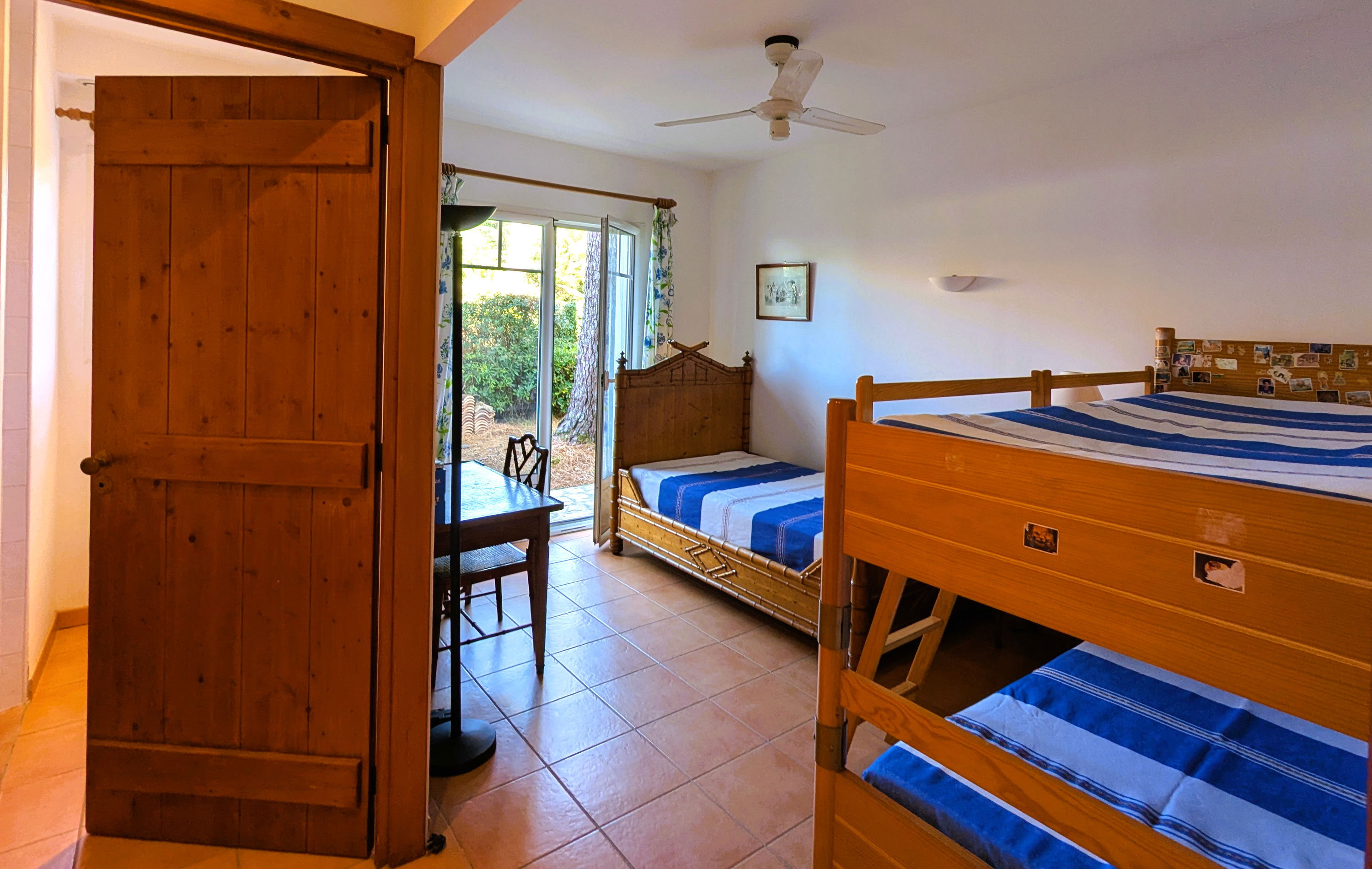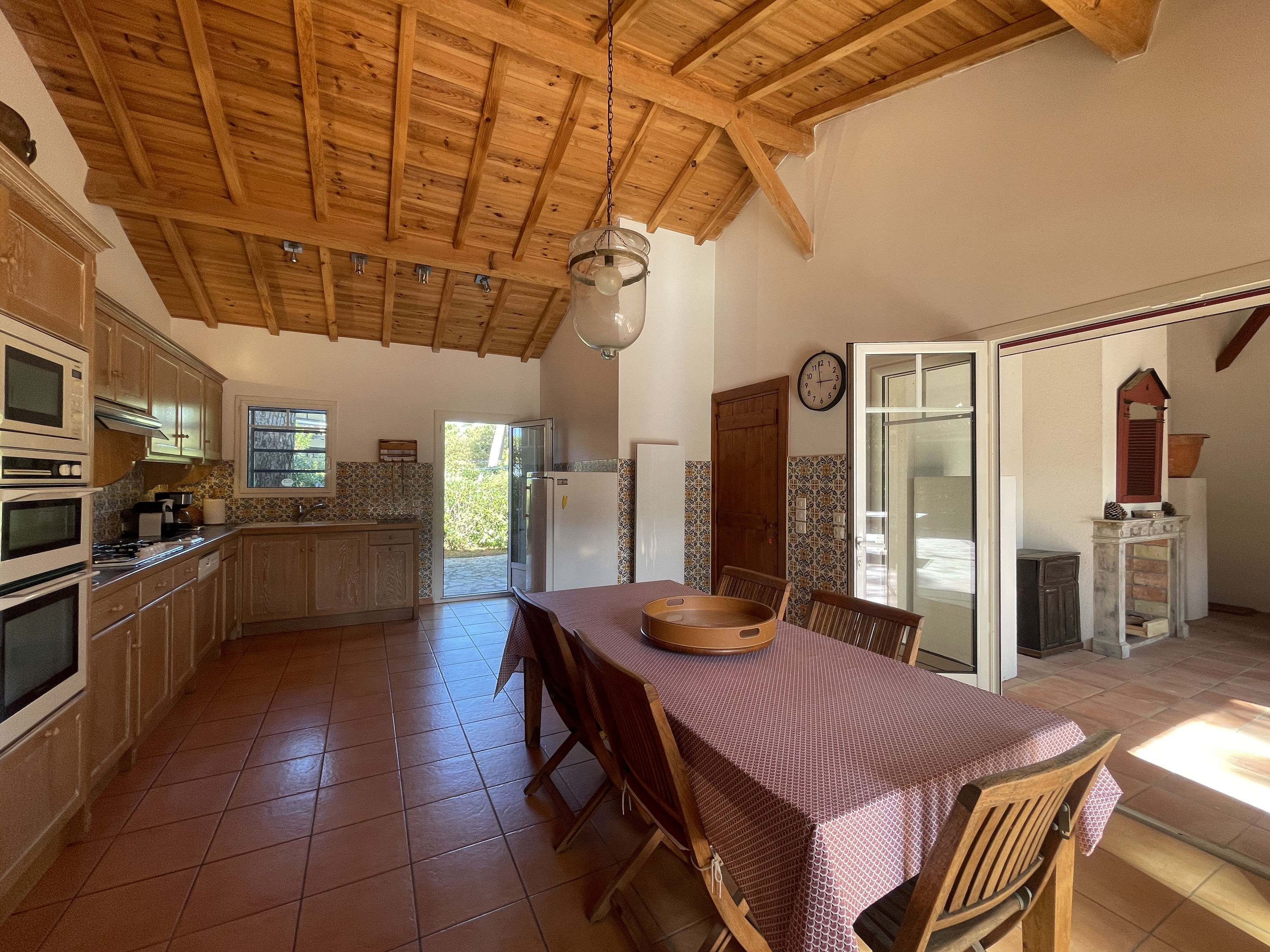 The ground floor of the villa consists of a large fitted and equipped eat-in kitchen which opens onto the patio (garden furniture, outdoor table, ping-pong table, etc.), laundry room, large living room facing East (over patio) and West (over pool) - dining area with a large table for 12 people, WC, 3 master suites, 2 of which face the pool (2 twin beds of 80x190cm, wardrobe, bathroom with WC), a children's bedroom (2 bunk beds + 1 single bed of 90cm) with private shower room (shower, sink and WC).