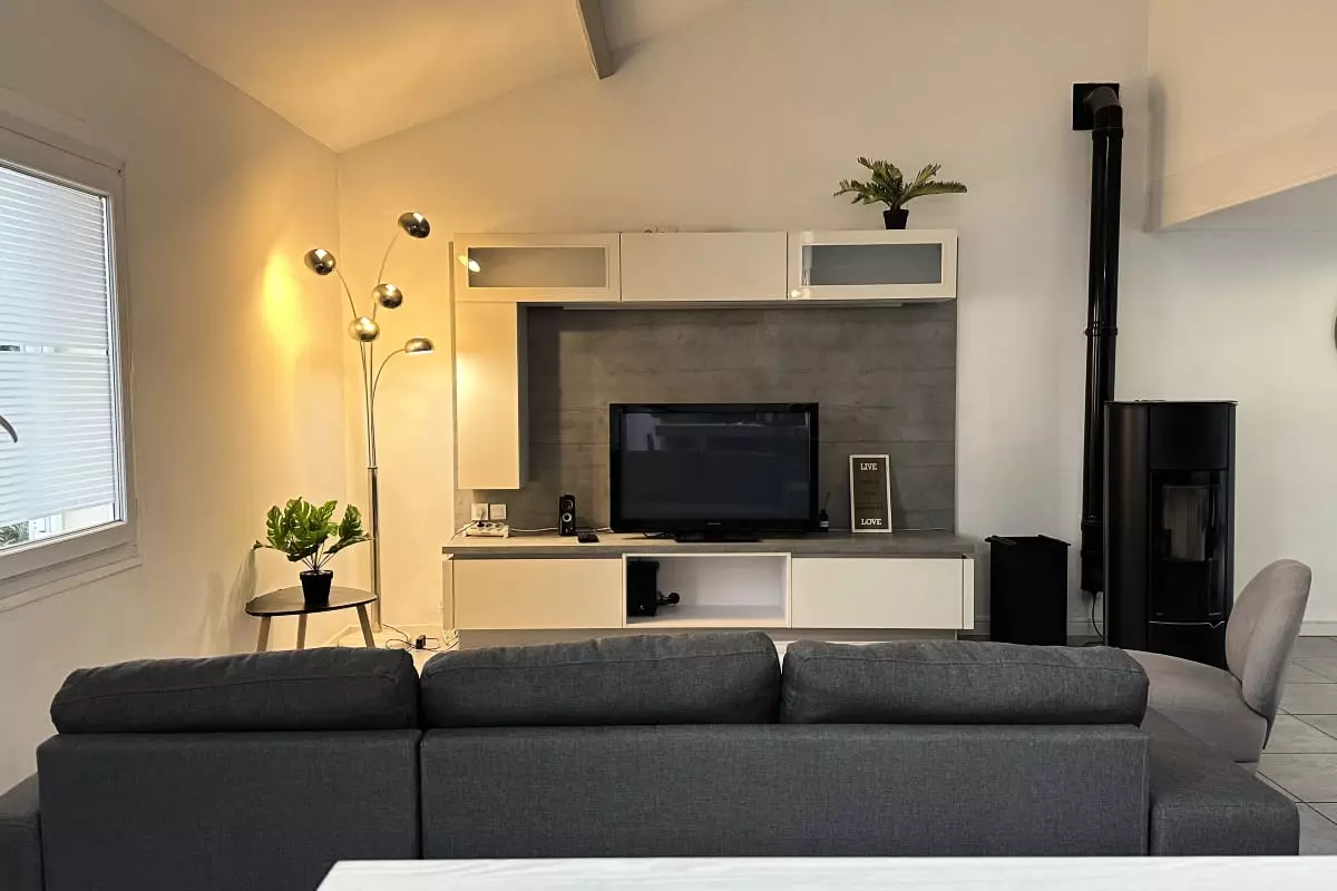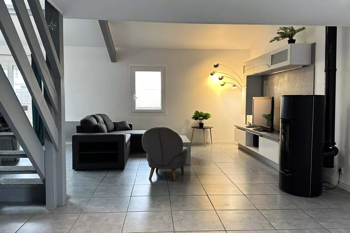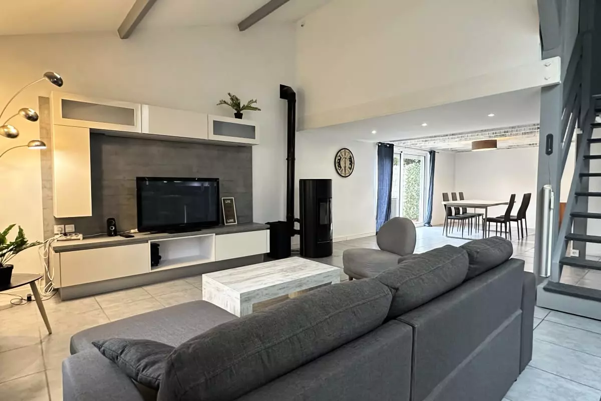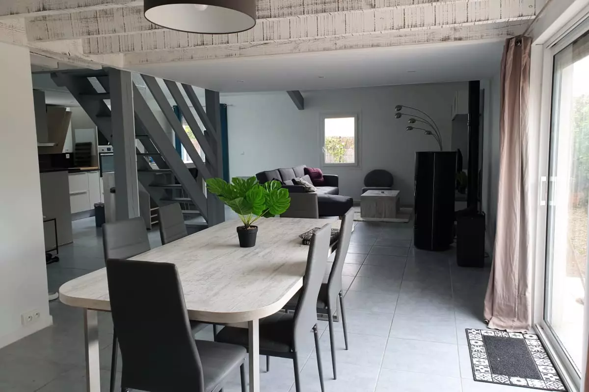 With its 100 m² of living space, it offers a unique "holiday chalet" atmosphere reminiscent of the Arcachon Basin. You will particularly appreciate its very spacious and light-filled living room, perfect for relaxing together.