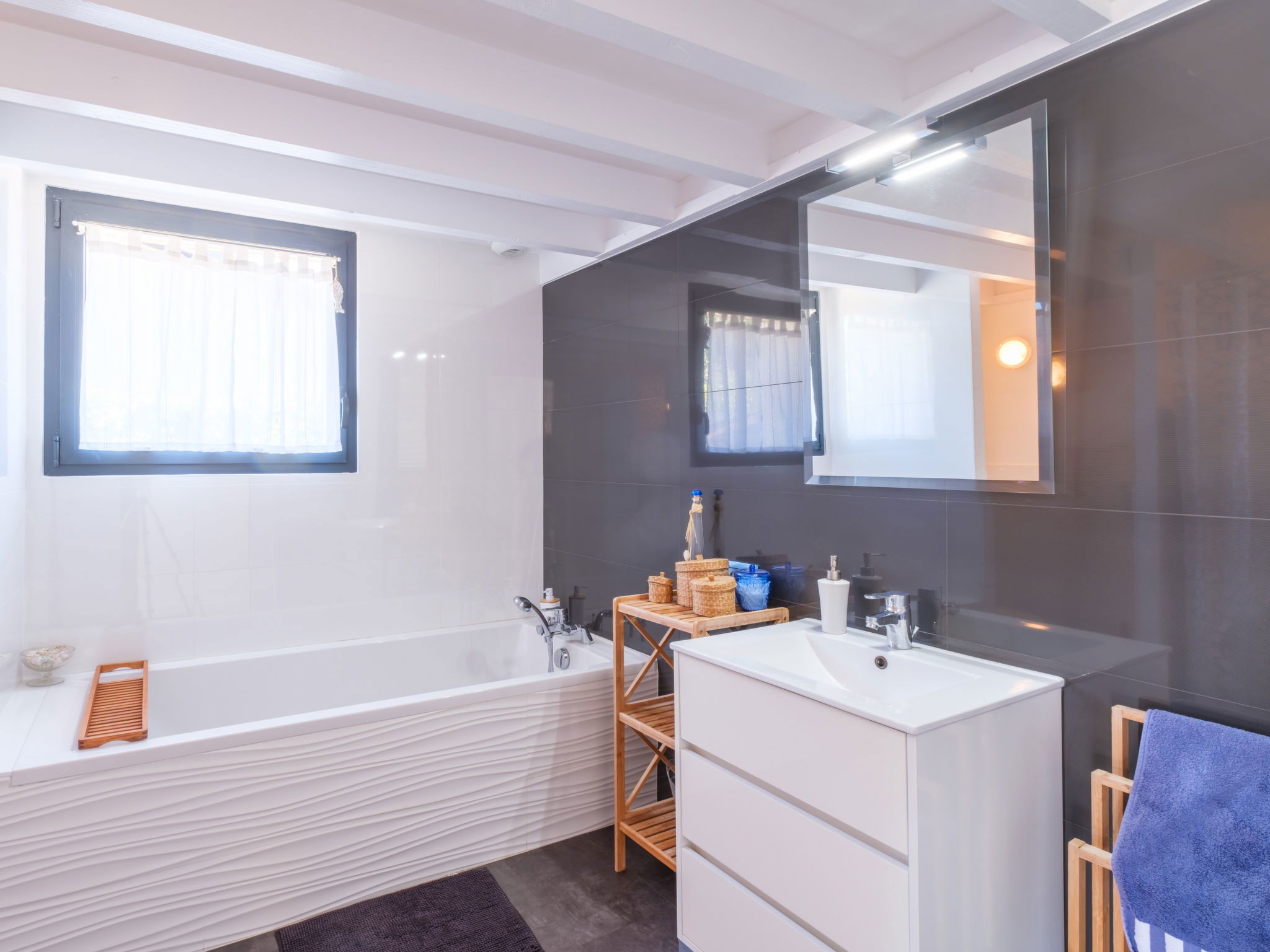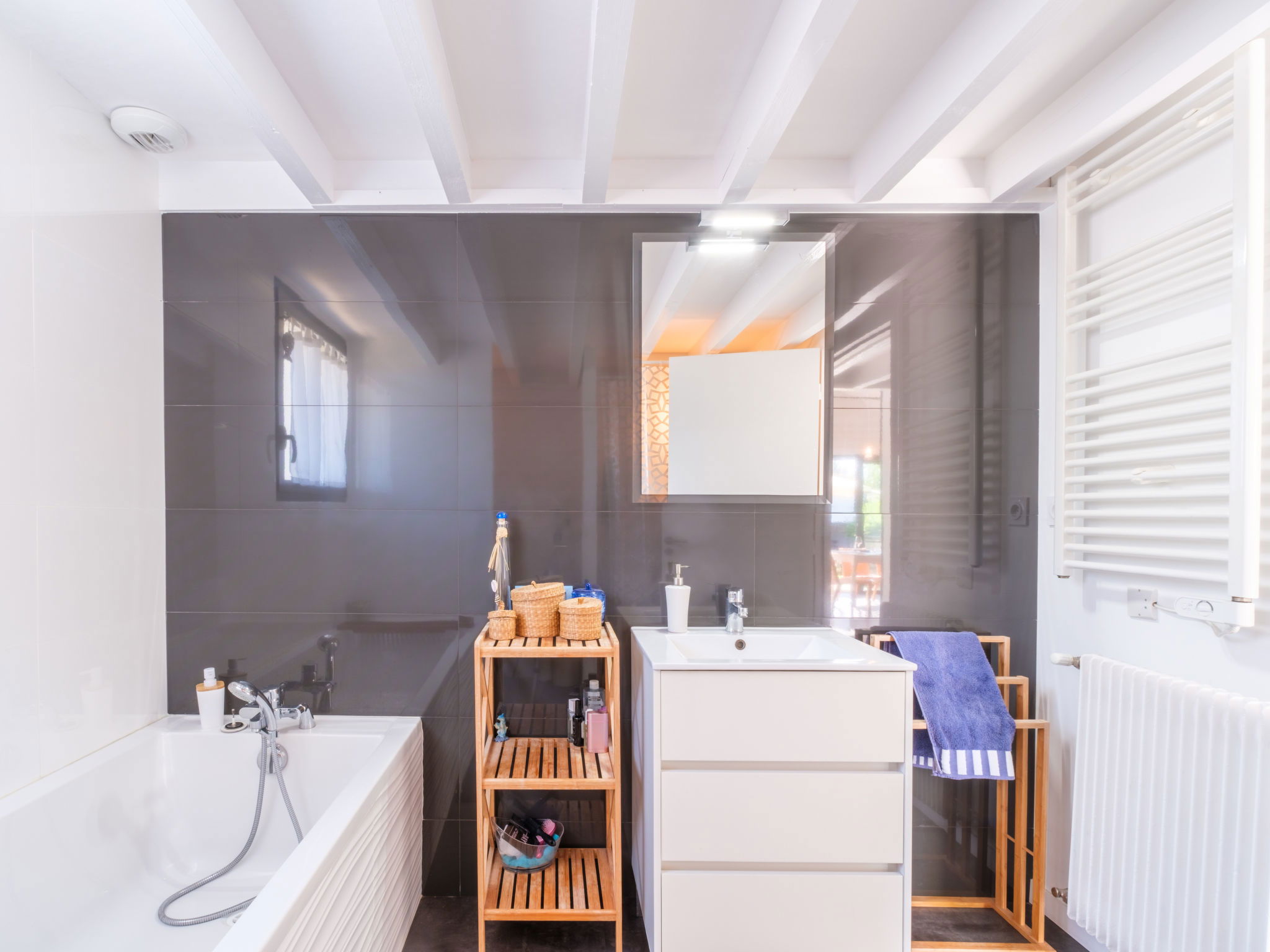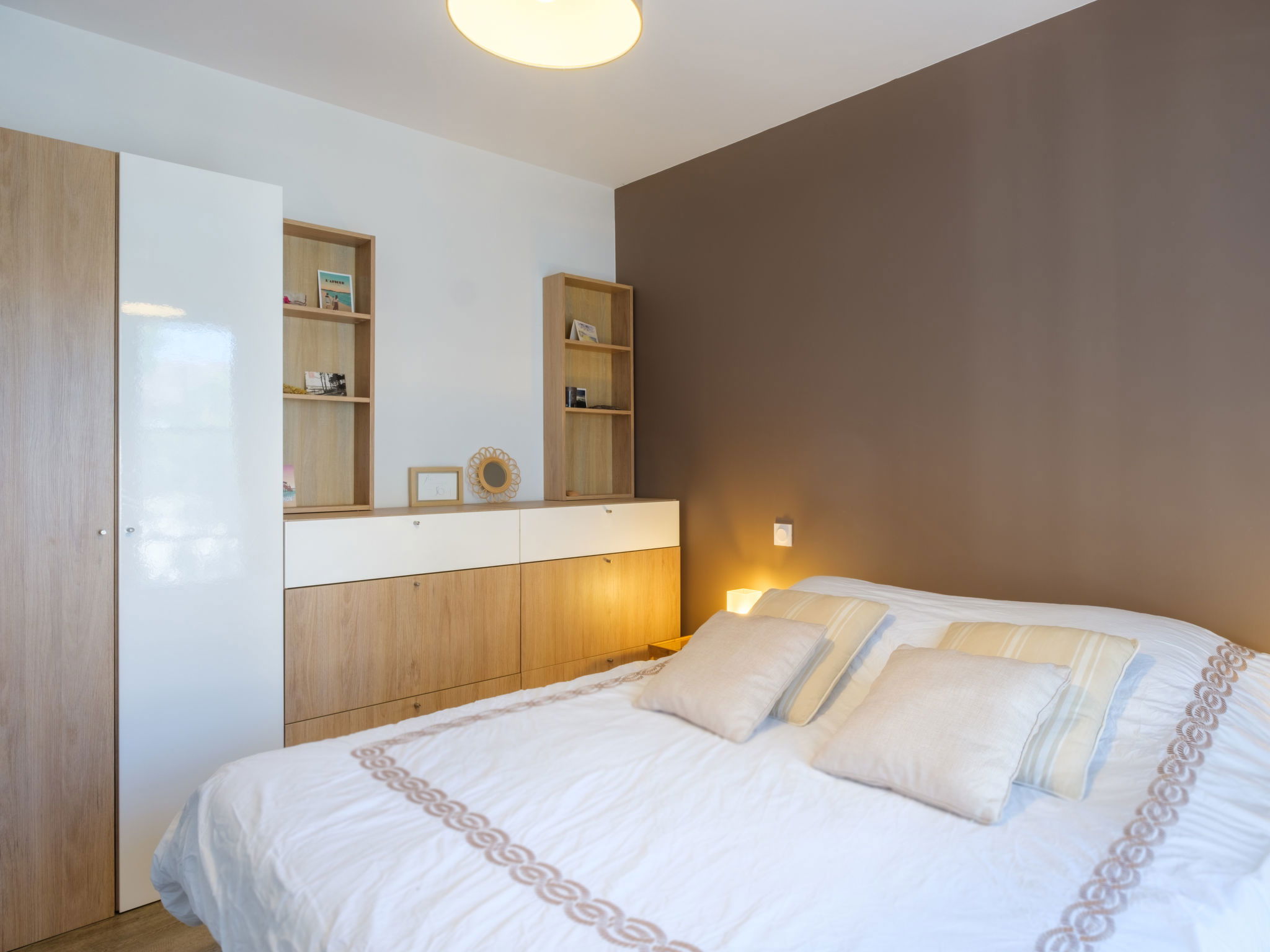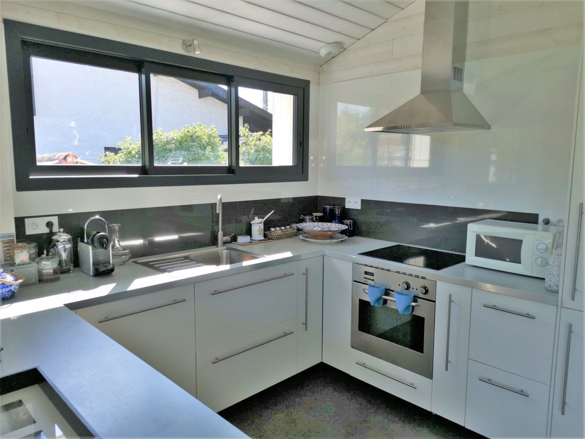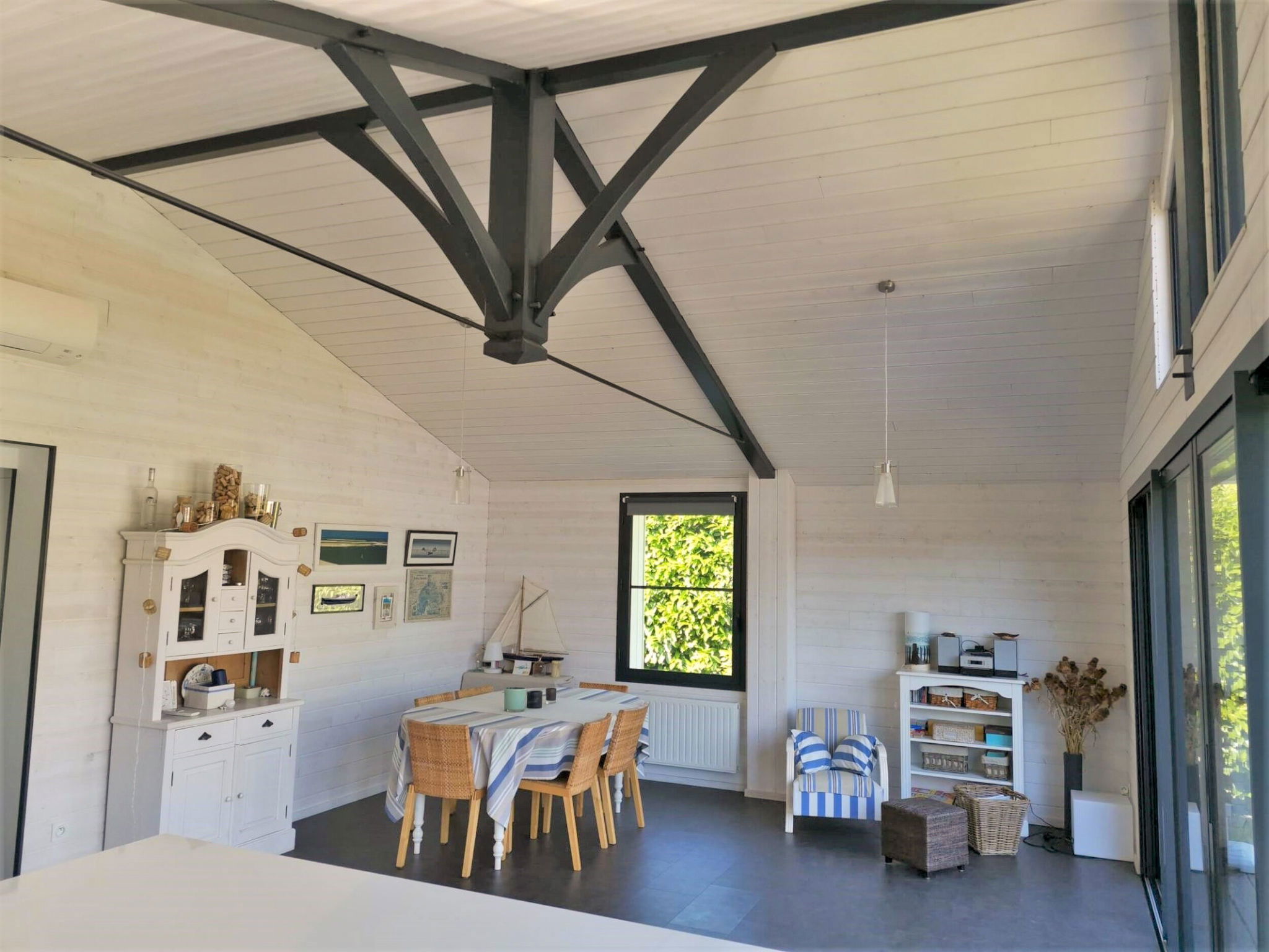 6-room villa 110 m2. Spacious and bright, comfortable and beautiful furnishings: large living/dining room 40 m2 with panoramic window with dining table and air conditioning. Exit to the terrace. Lounge with TV (flat screen). 2 rooms, each room with 1 french bed (140 cm, length 190 cm). 1 room with 1 french bed (160 cm, length 200 cm). Gallery with sloping ceilings, ceiling height 50 - 180 cm with 1 french bed (140 cm, length 190 cm). Open kitchen (oven, dishwasher, 4 induction hot plates, toaster, kettle, microwave, freezer, electric coffee machine, Capsules for coffee machine (Nespresso) extra). Bath/WC, shower, sep. WC. Electric heating, gas heating. Terrace, south-east facing position. Terrace furniture, barbecue (portable), deck chairs (4). Facilities: washing machine, hair dryer. Internet (WiFi, free). Please note: non-smoking house. Smoke alarm. Bed layout is flexible. There are more sleeping options available than the maximum number of people allowed which may, however, not be exceeded. Offer by a private individual according to Art. 155, IV of CGI. 332290002367D